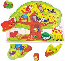 Fedezze fel a fa, fa alakú kirakót 11 darab állatfigurával, amely fejleszti a logikus gondolkodást, a képzeletet és a finommotorikát. A masszív rétegelt lemez és a tartós kivitel hosszú élettartamot és biztonságos játékot biztosít már 12 hónapos kortól.