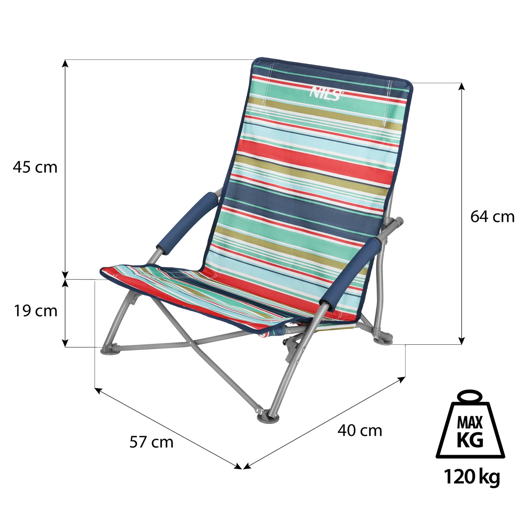 A maximális kényelemért a szék habos kartámaszokkal és alacsony ülőmagassággal rendelkezik, ami ideális a strandra. A kör alakú műanyag lábak növelik a stabilitást, megakadályozzák a csúszást, és puha felületen, például homokban, nem süllyednek el. Összecsukás után a szék elfér a mellékelt hordtáskában, amit értékelni fog utazás és tárolás közben.