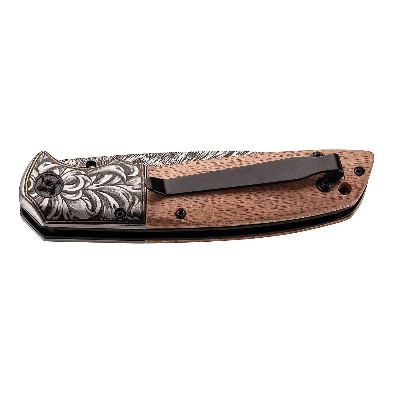 Elegáns HERBERTZ zsebkés mindennapi használatra vagy stílusos ajándéknak. AISI 420 rozsdamentes acél pengével, gravírozott virágmintával, kényelmes nyitás hüvelykujjas stifttel és biztonságos Linerlock zár megoldással. A diófa markolat kényelmes fogást biztosít, nem hiányzik a jobb oldali hordást lehetővé tévő zsebklipsz és a zsinórlyuk sem.