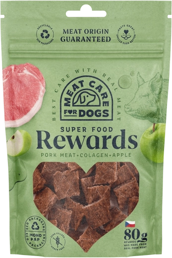 Természetes húsos finomság kutyáknak gabonamentesen, hozzáadott cukrok és mesterséges színezékek nélkül, valódi friss húsból készítve. Sertéshúst és magas arányú kollagént tartalmaz az ízületek és a csontok támogatására, kiegészítve almával a jobb emésztésért. A csomagolás teljes mértékben újrahasznosítható, és védőgázas környezetben csomagolt a garantált minőség érdekében.