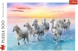Ez a puzzle 500 darabból áll, bemutatva a fehér lovak szépségét és eleganciáját teljes gyorsaságban. Összerakva a kép mérete 48x34 cm lesz.
