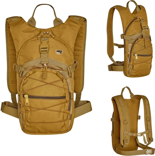 A fő rekesz elválasztóval és két karabinerrel rendelkezik a víztartály felakasztásához (nem tartozék). A csövet praktikus módon jobb vagy bal oldalon vezetheted ki. Emellett találsz egy nagy hálós zsebet pánttal és csattal, egy kisebb nyitott hálós zsebet, egy további cipzáras rekeszt és egy biztonságos cipzáras zsebet. A külső gumis zsinór ütközővel sisakot vagy derékaljat tart, míg a kompressziós hevederek stabilizálják a terhet.