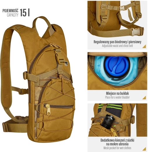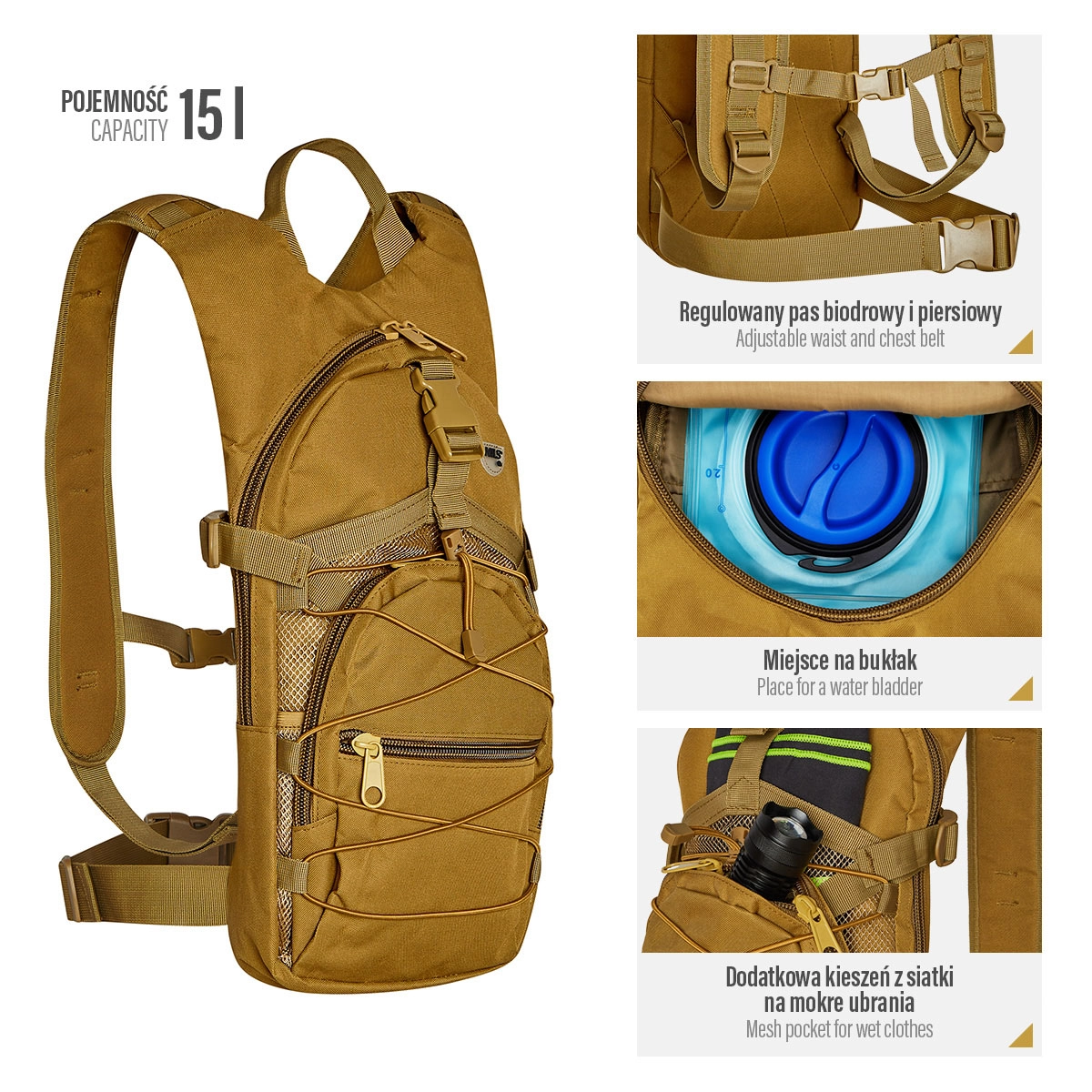 Kompakt és tartós, 15 literes hátizsák egynapos kirándulásokhoz, városi használathoz és sétákhoz. Kétoldali kivezetéssel ellátott víztartály-előkészítést, több zsebet az áttekinthető rendszerezéshez, valamint könnyű, vízlepergető nejlont és strapabíró poliésztert kínál. A stabil hordást mell- és derékpánt, kompressziós hevederek és külső gumis zsinór segítik sisakhoz vagy derékaljhoz.
