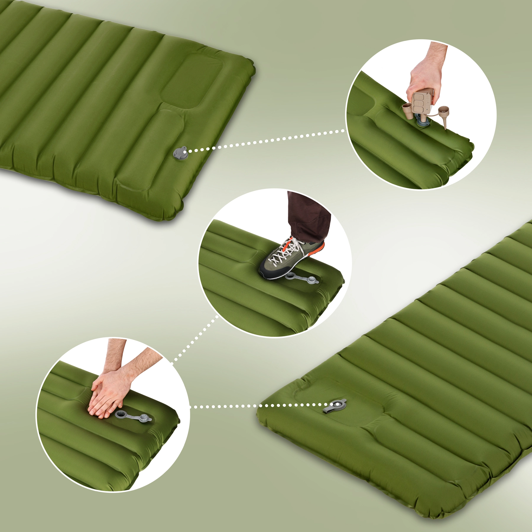 A beépített láb-/kézipumpa erőfeszítés nélkül, külön felszerelés nélkül fújja fel a derékaljat. A szelepen keresztül külső pumpa is csatlakoztatható.