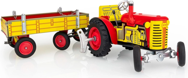 Klasszikus bádog játék kicsiknek és nagyoknak, a mezőgazdasági technika rajongóinak: Zetor traktor lekapcsolható platós pótkocsival és kulcsos rugós szerkezettel. 3 fokozatot kínál (előre, üres, hátra), működő kormányzást és kéziféket. Precíz cseh kézműves kivitel, Biztonságos játék tanúsítvány és nyomtatott bádoglemezből készült, tartós felépítés műanyag kerekekkel.