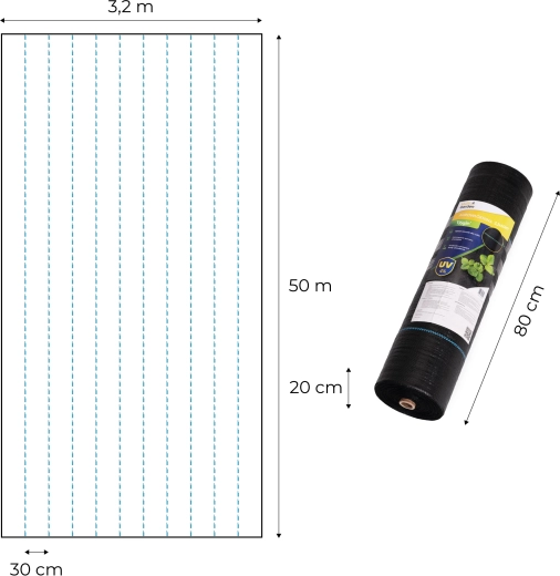 A kék vezetővonalak 30 cm-enként felgyorsítják az ültetési tervezést és biztosítják az egyenletes tőtávolságot. A textília alkalmas kéreg, kavics vagy díszkövek alá, díszágyásokba, zöldségágyásokba, cserjék, tuják, gyümölcsfák alá, valamint kerti ösvényekre.