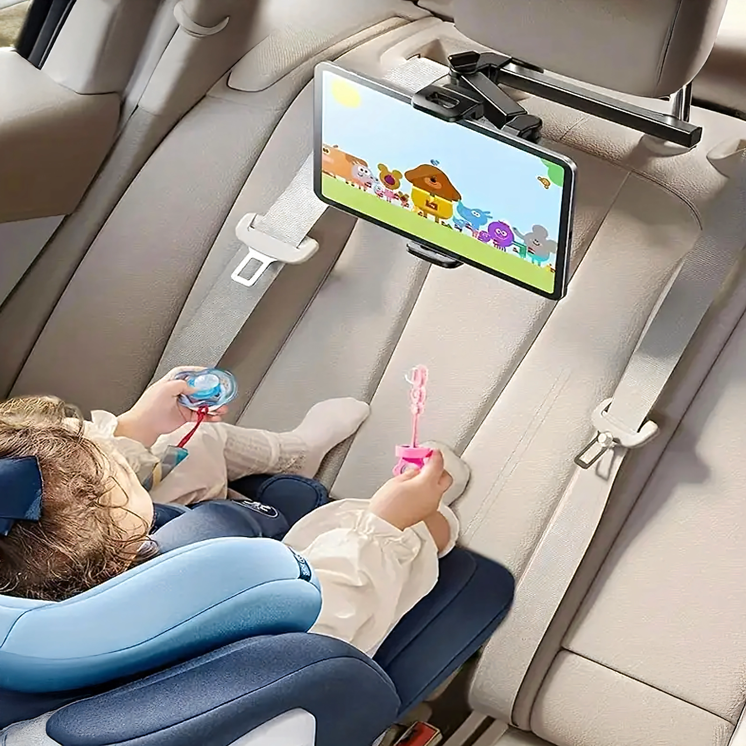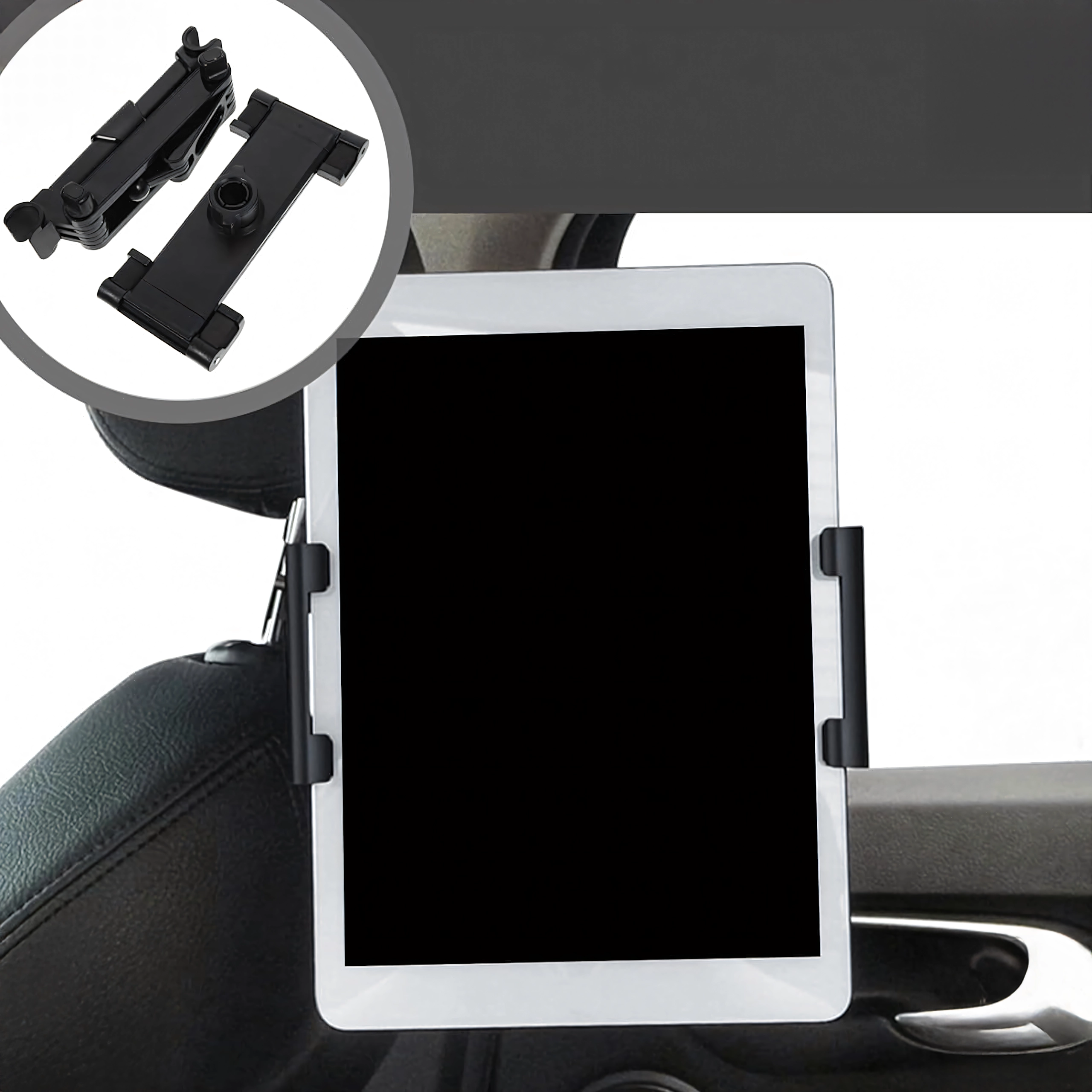 A tartó könnyen rögzíthető a fejtámla rúdjai közé, és néhány perc alatt használatra kész a hátsó utasok számára – szerszám nélkül.