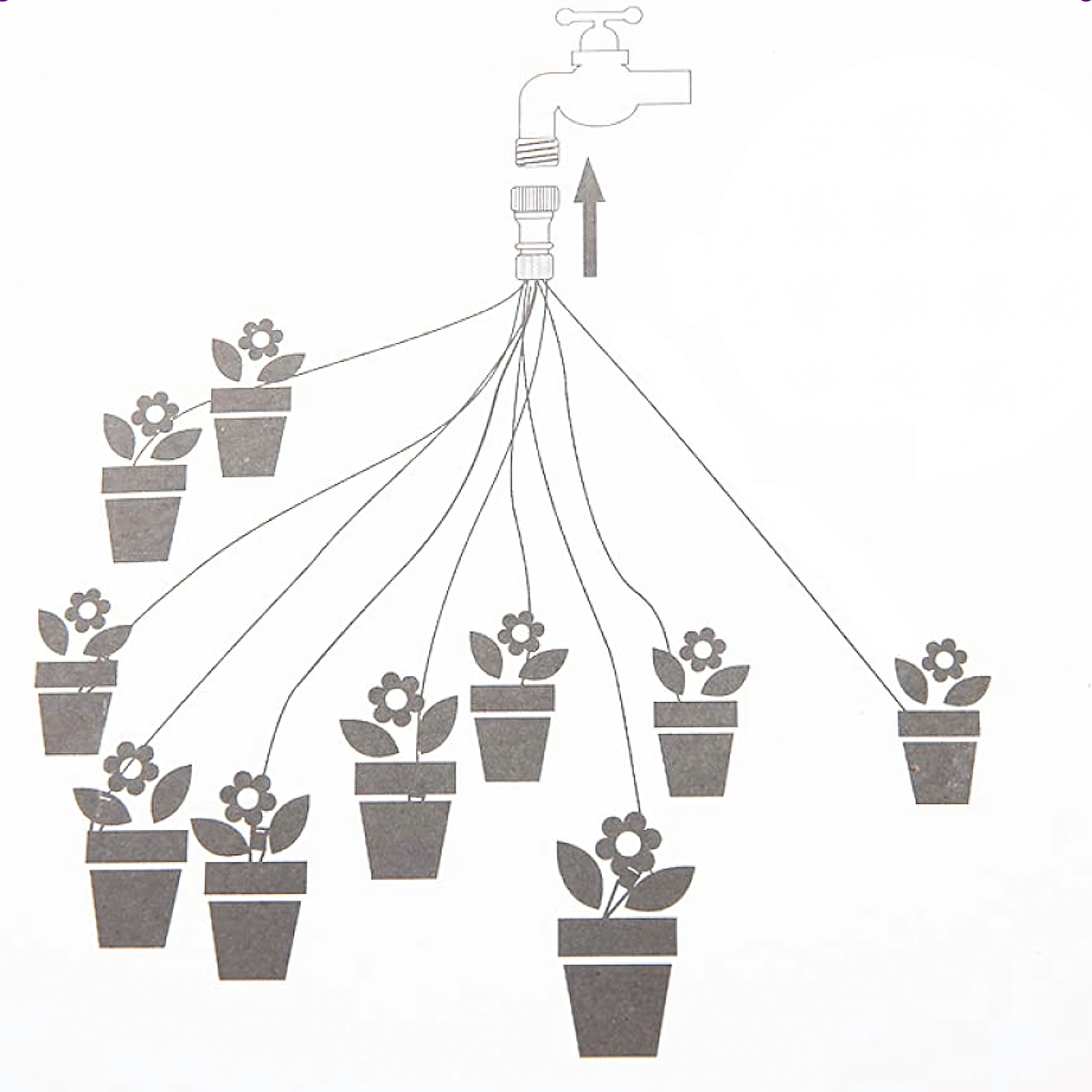 A praktikus elosztó és a rugalmas csövek egy vízforrásból több cseréphez vagy ágyáshoz is eljuttatják a vizet egyszerre – ideális erkélyekre és üvegházakba.