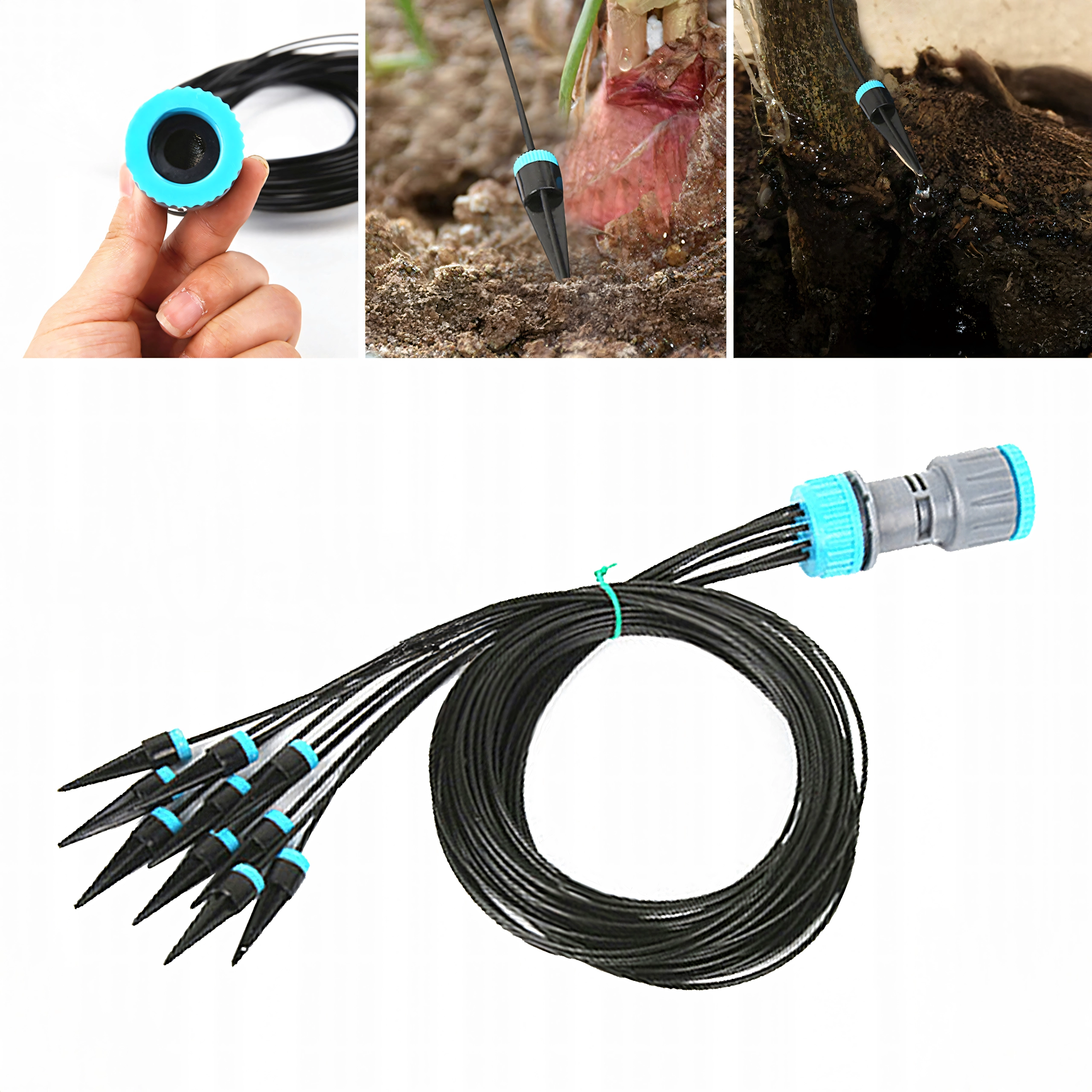 A kék szabályzógyűrűk a csepegtetőkön lehetővé teszik a vízmennyiség növényfajhoz és mérethez igazítását – a finom párásítástól a bőségesebb öntözésig.