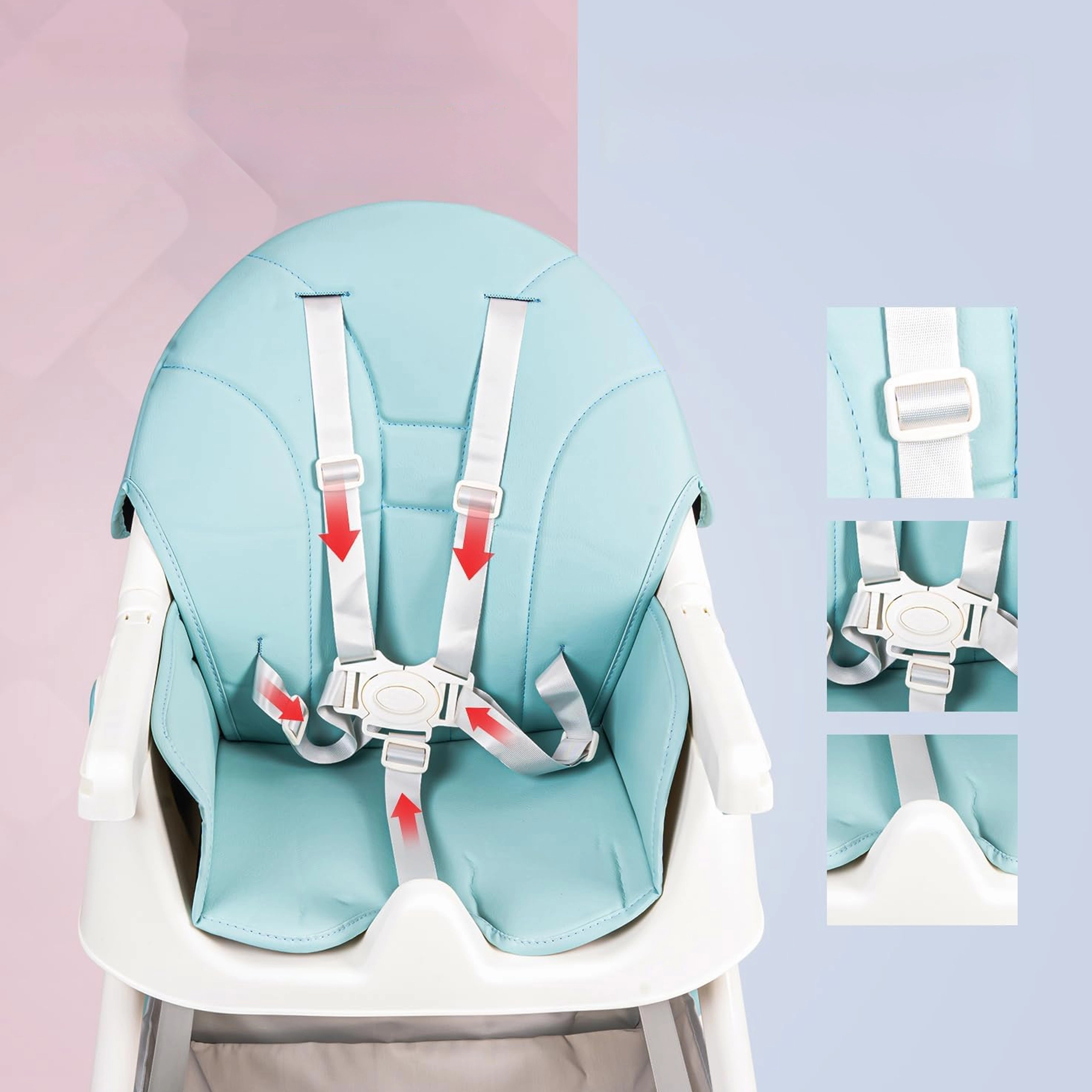 A formázott ülőrész, a puha párnázás, az 5 pontos öv és a terpesztőbetét stabilan és kényelmesen tartja a gyermeket étkezés és játék közben is.