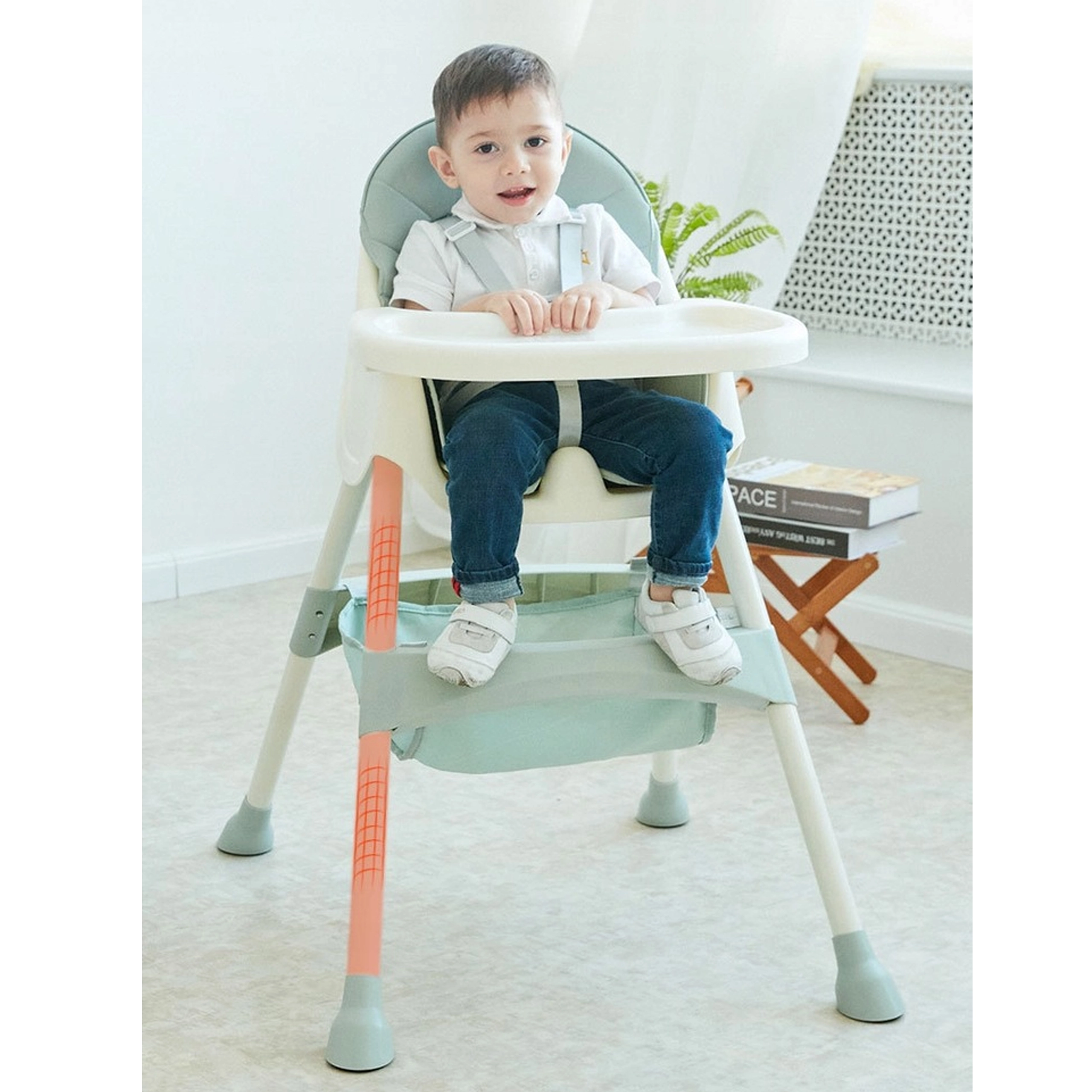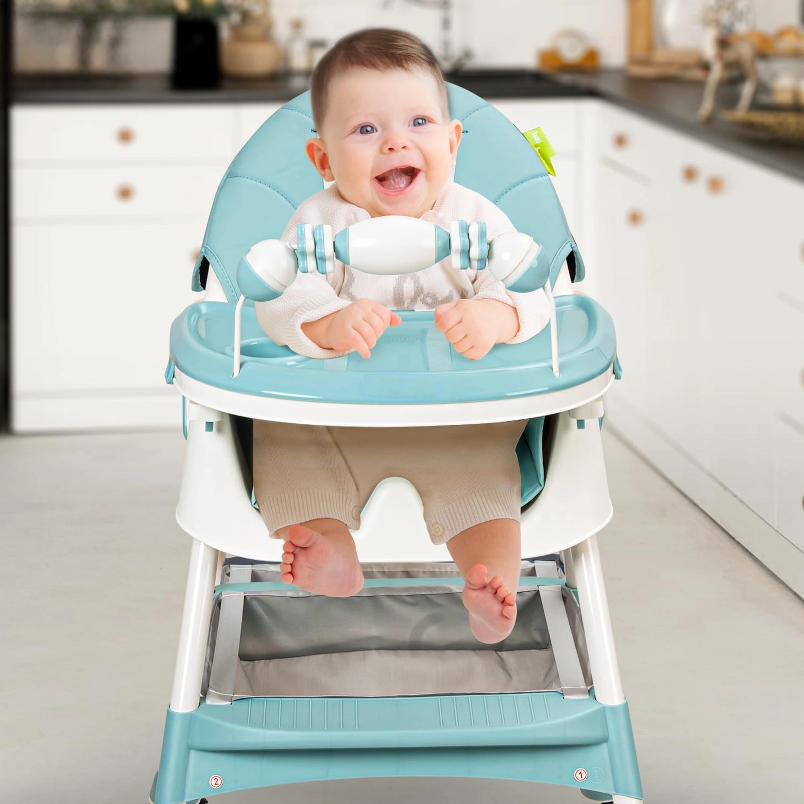 A széles tálca pohártartóval kivehető és mosható. A csúszásgátló lábak és az ülés alatti tárolókosár mindennapi praktikummal szolgálnak.