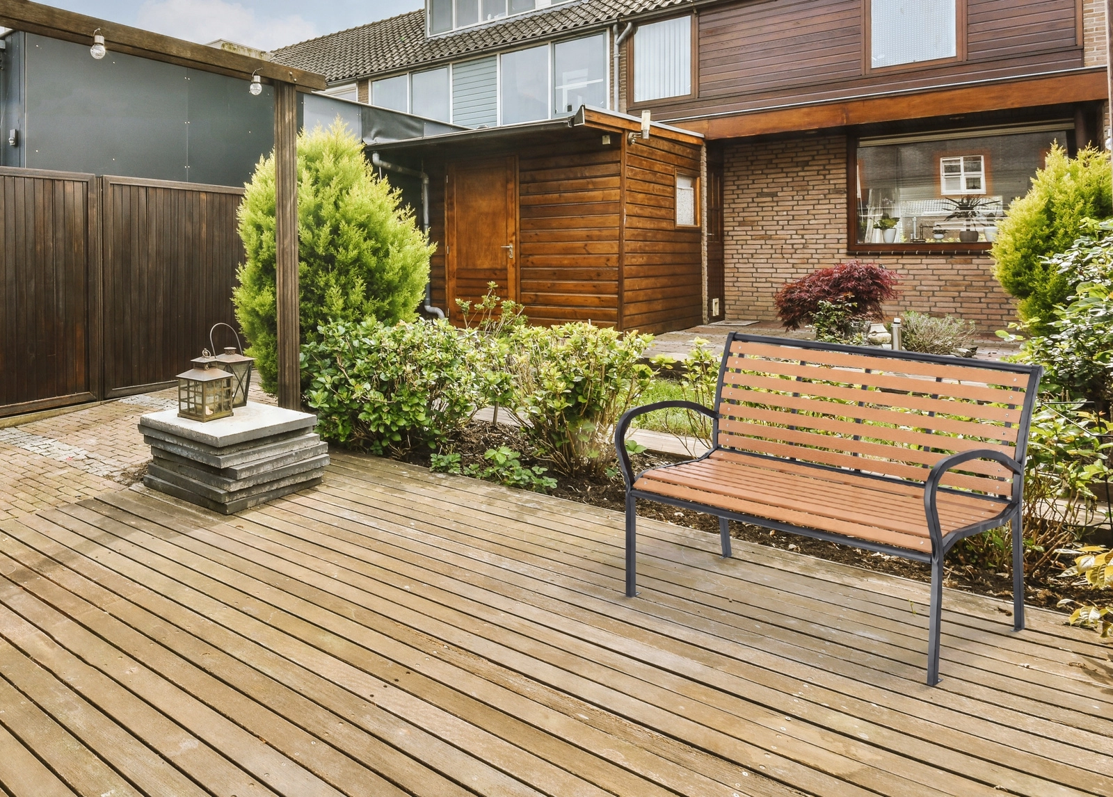 A barna dekorú műanyag lamellák fának tűnnek, mégis jobban bírják az esőt és a napot, és csak minimális karbantartást igényelnek.