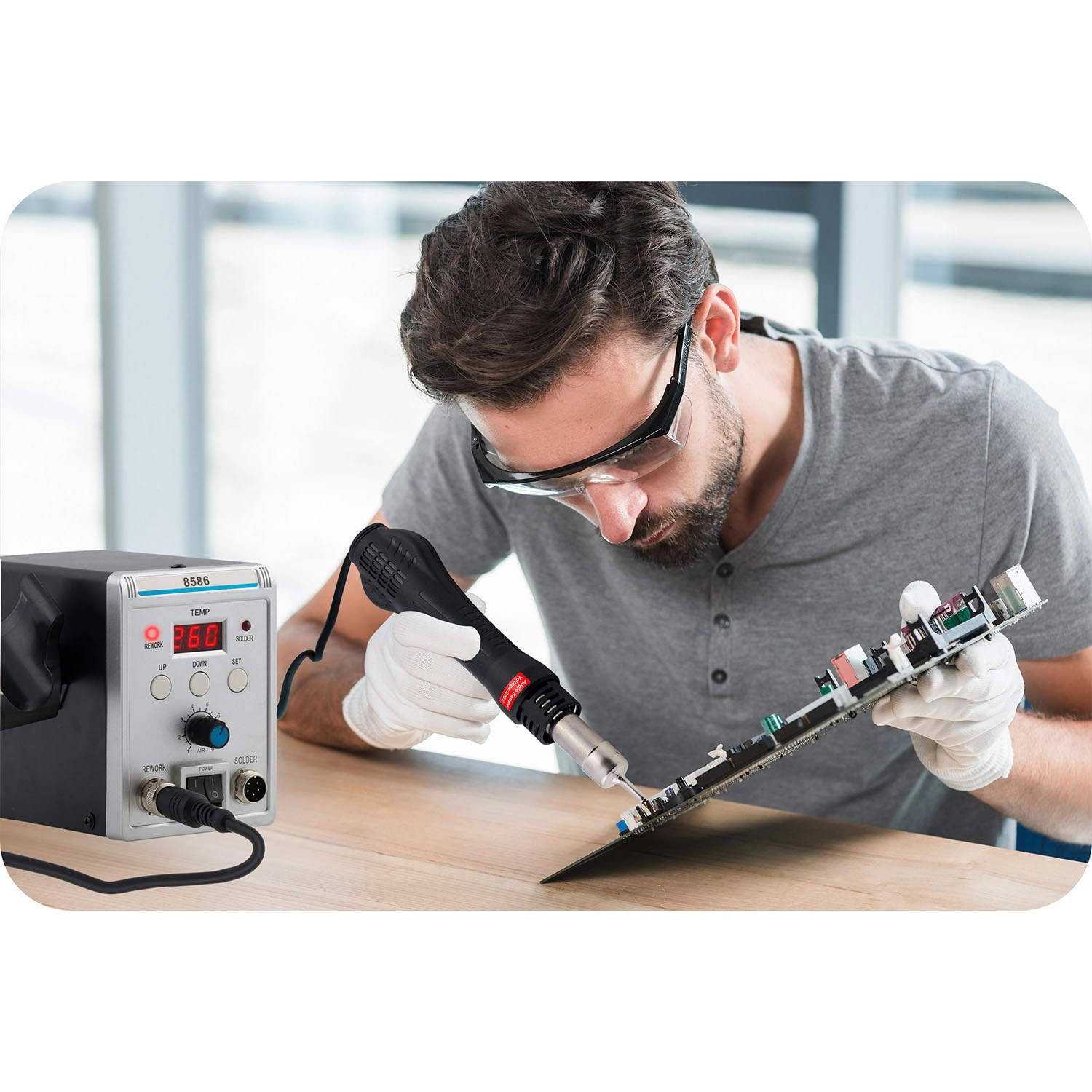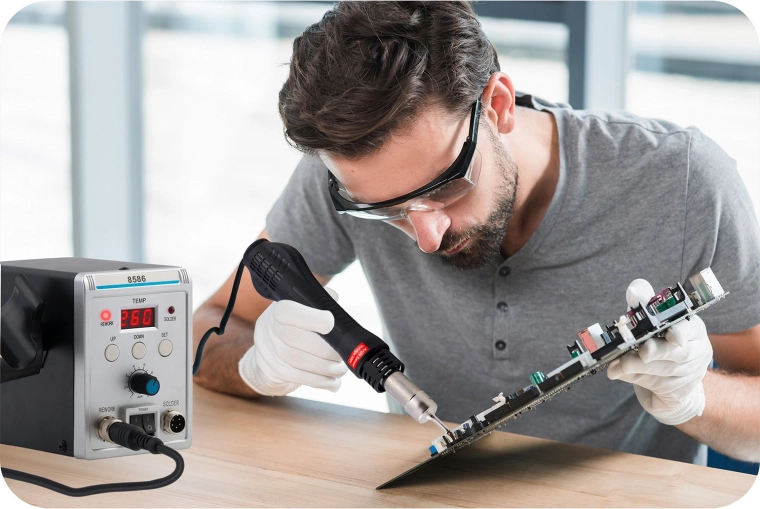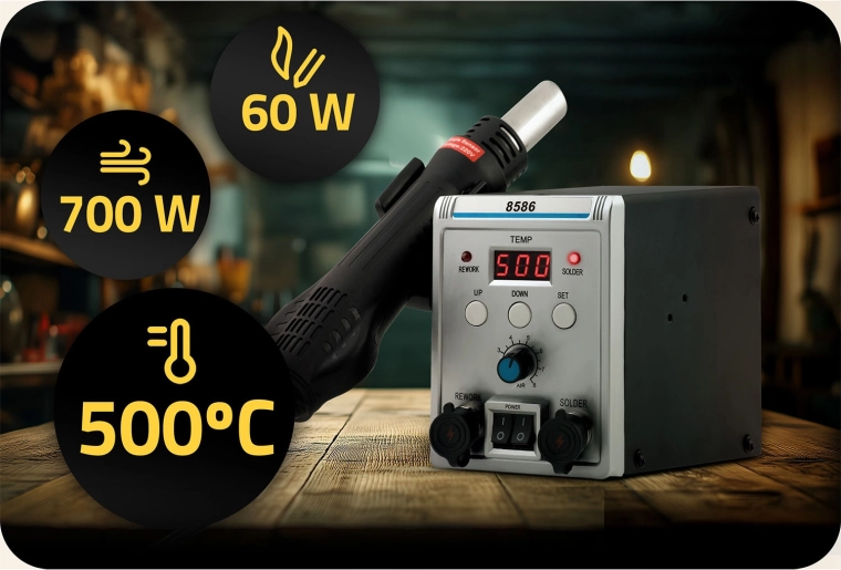 - Forró levegő (100–500 °C / 700 W): pontos hőirányítás 5 fúvókával; ideális SMD kiforrasztáshoz, BGA reballinghoz, zsugorcsőhöz és ragasztók oldásához.