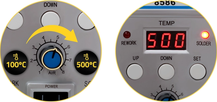 Forrasztás és rework egyben – a forró levegő és a klasszikus páka kombinációja kiterjeszti a lehetőségeket a THT és SMD szereléstől a BGA reballingig. Az áttekinthető LCD kijelző és az UP/DOWN/SET gombok megkönnyítik a pontos beállítást, míg a légáram szabályzása (Air) finom és egyenletes melegítést biztosít az alkatrészek károsítása nélkül.
