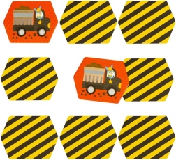 A hatszögletű kártyák világos narancssárga háttérrel és építőipari gépeken tevékenykedő állatokkal jellemezhetőek, melyek növelik a gyermekek érdeklődését a tanulás és a megismerés iránt.
