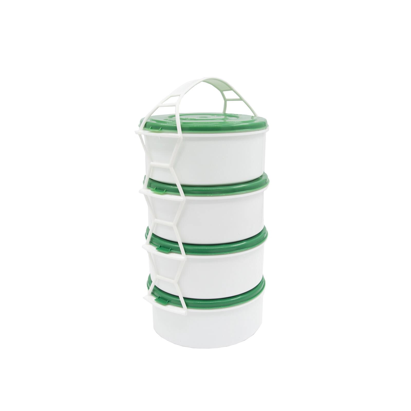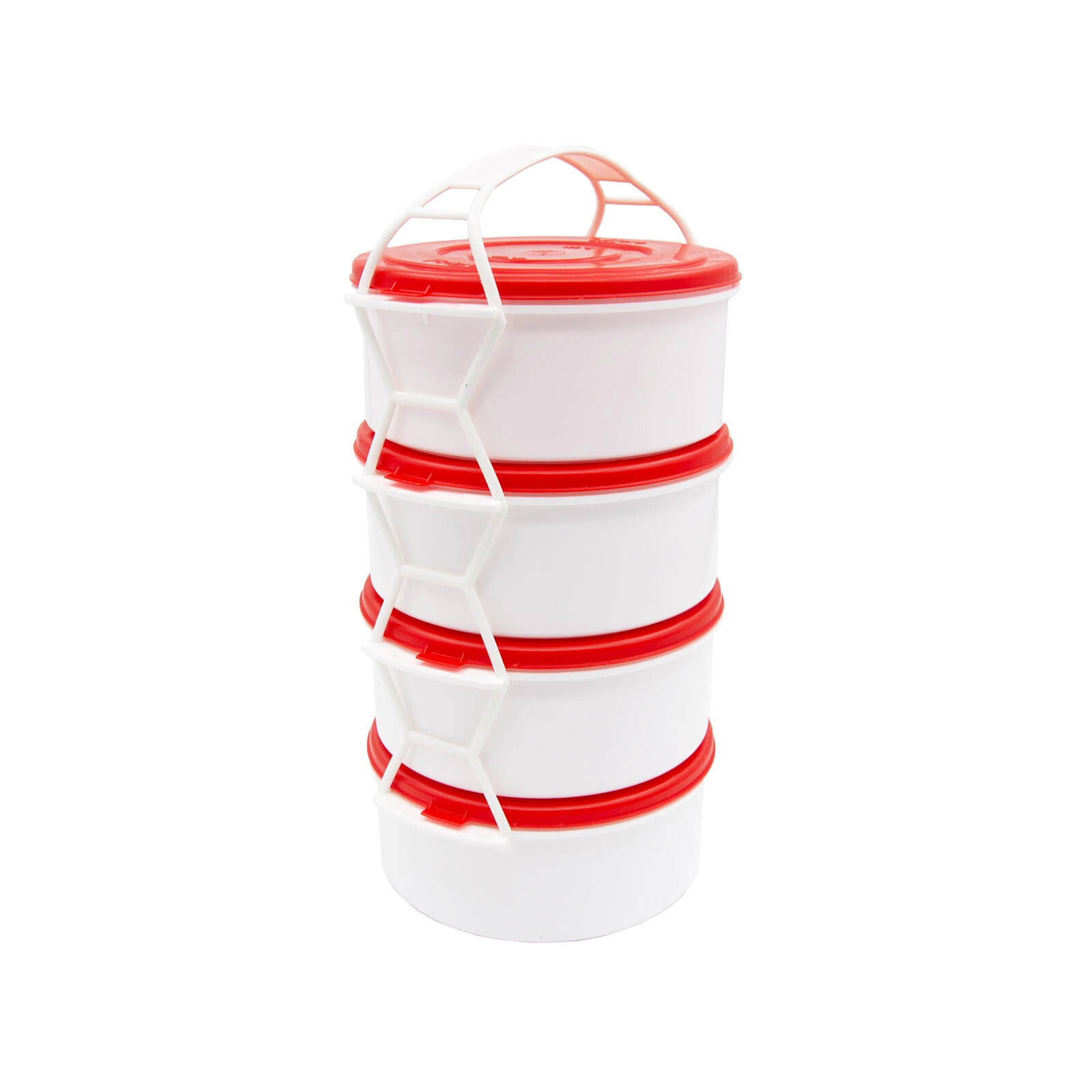 A fehér tálak és a különböző árnyalatú, színes fedelek segítik a gyors tájékozódást a tartalomban, és növelik az útközbeni étkezés esztétikáját. A minőségi műanyag könnyű, egyszerűen tisztítható, és ideális a különféle ételek praktikus tárolásához és szállításához.