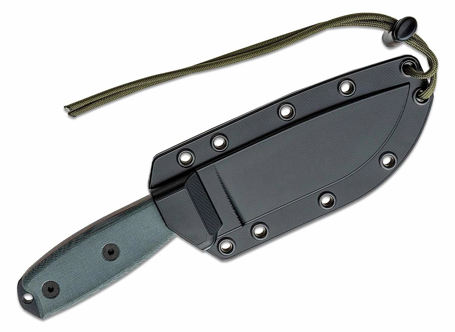 A Micarta anyagú, szürke markolat remekül fekszik a kézben, biztos fogást ad még nehéz körülmények között is, a végén pedig zsinórfurat található. A csomag tartalma egy fekete műanyag tok rögzítési lehetőséggel a felszerelésre, így a kés mindig biztonságosan és kényelmesen kéznél van.