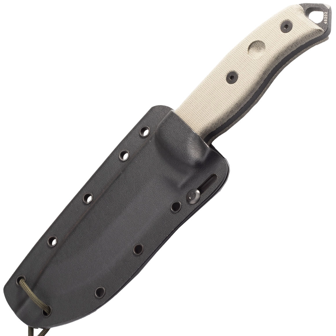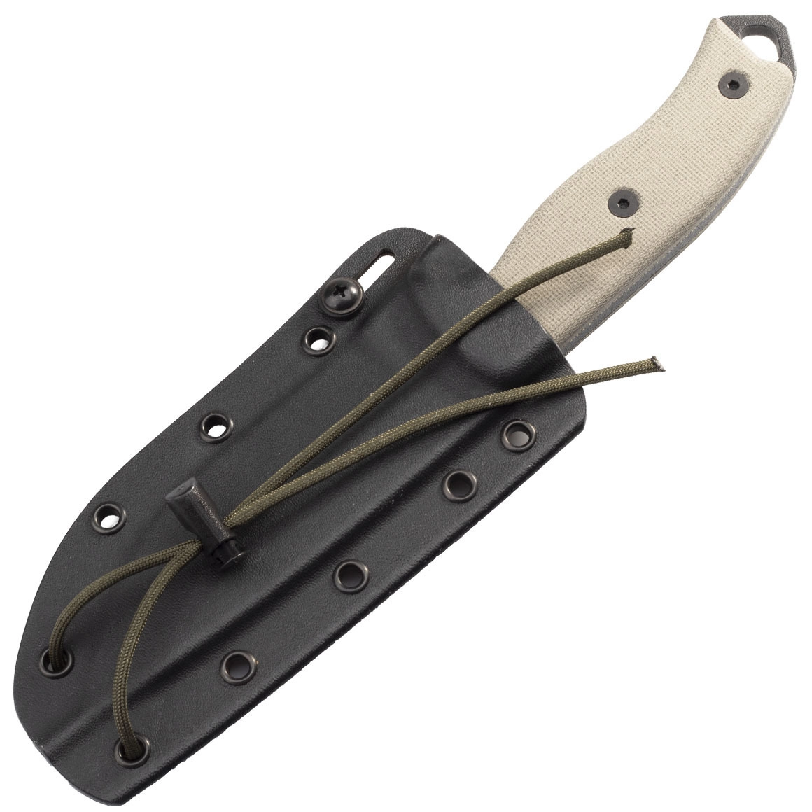 Texturált micarta jimpinggel, masszív üvegtörő tüske zsinórfurattal, valamint tartós Kydex tok többféle rögzítési lehetőséggel a kényelmes és biztonságos hordáshoz.