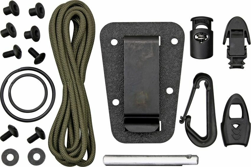 A szett tartalma: paracord, zár a zsinórhoz, osztott karikák, ferrocerium rúd, vészsíp, műanyag karabiner és szerelő hardver a hordás testreszabásához.