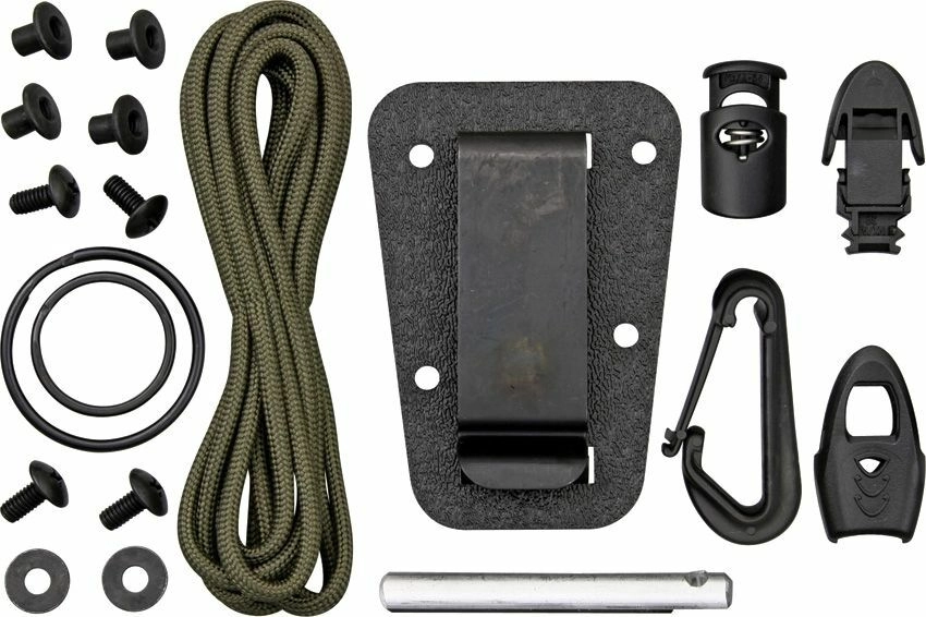 A többnyílásos markolat testreszabható – a paracordos körbetekeréstől a zsinóron vagy karikán való felfüggesztésig. A késhez erős műanyag tok jár, amely biztonságos és diszkrét hordást tesz lehetővé nyakban vagy a felszerelésen. A csomagot egy praktikus túlélőkészlet egészíti ki, hogy készen álljon a váratlan helyzetekre.