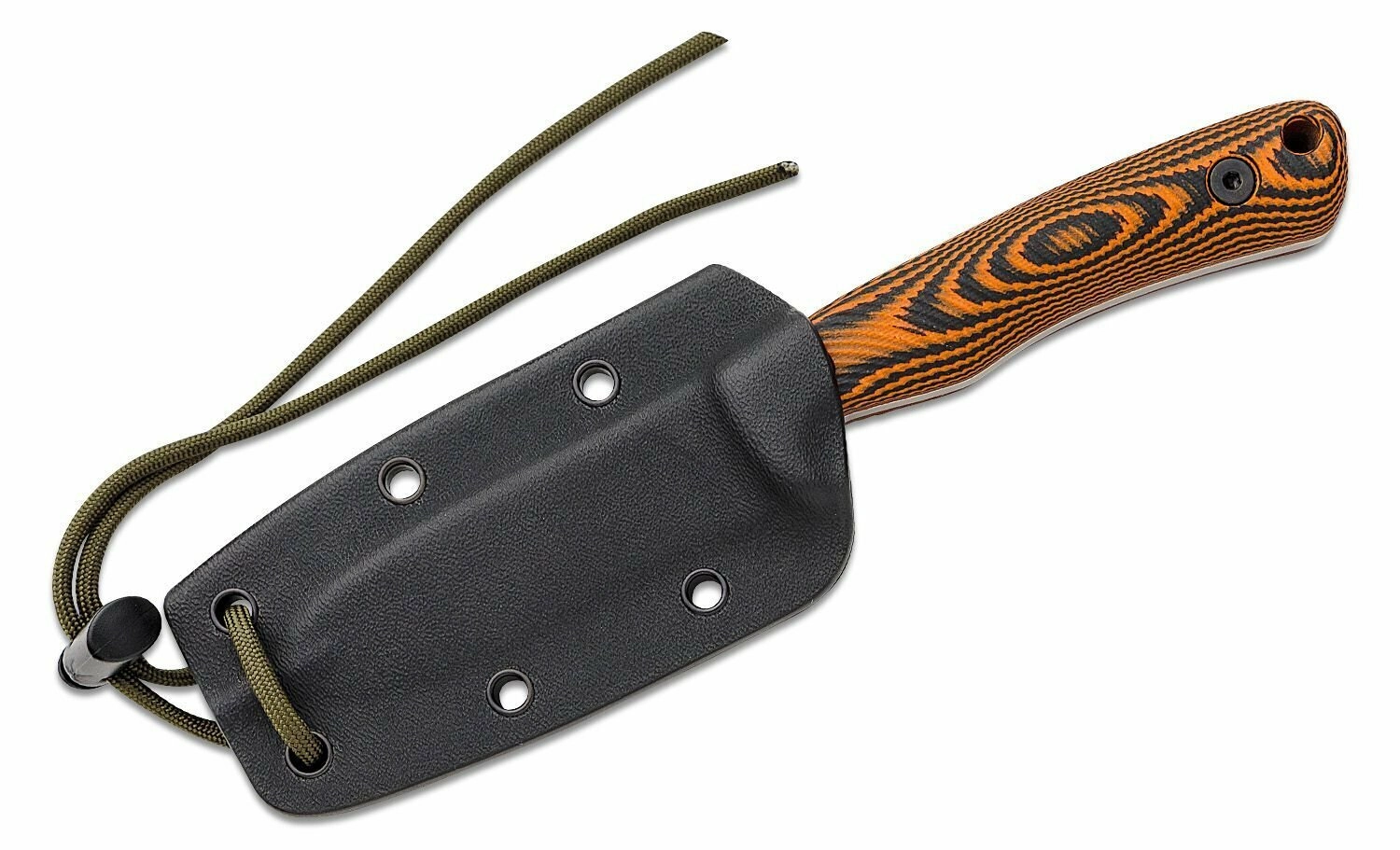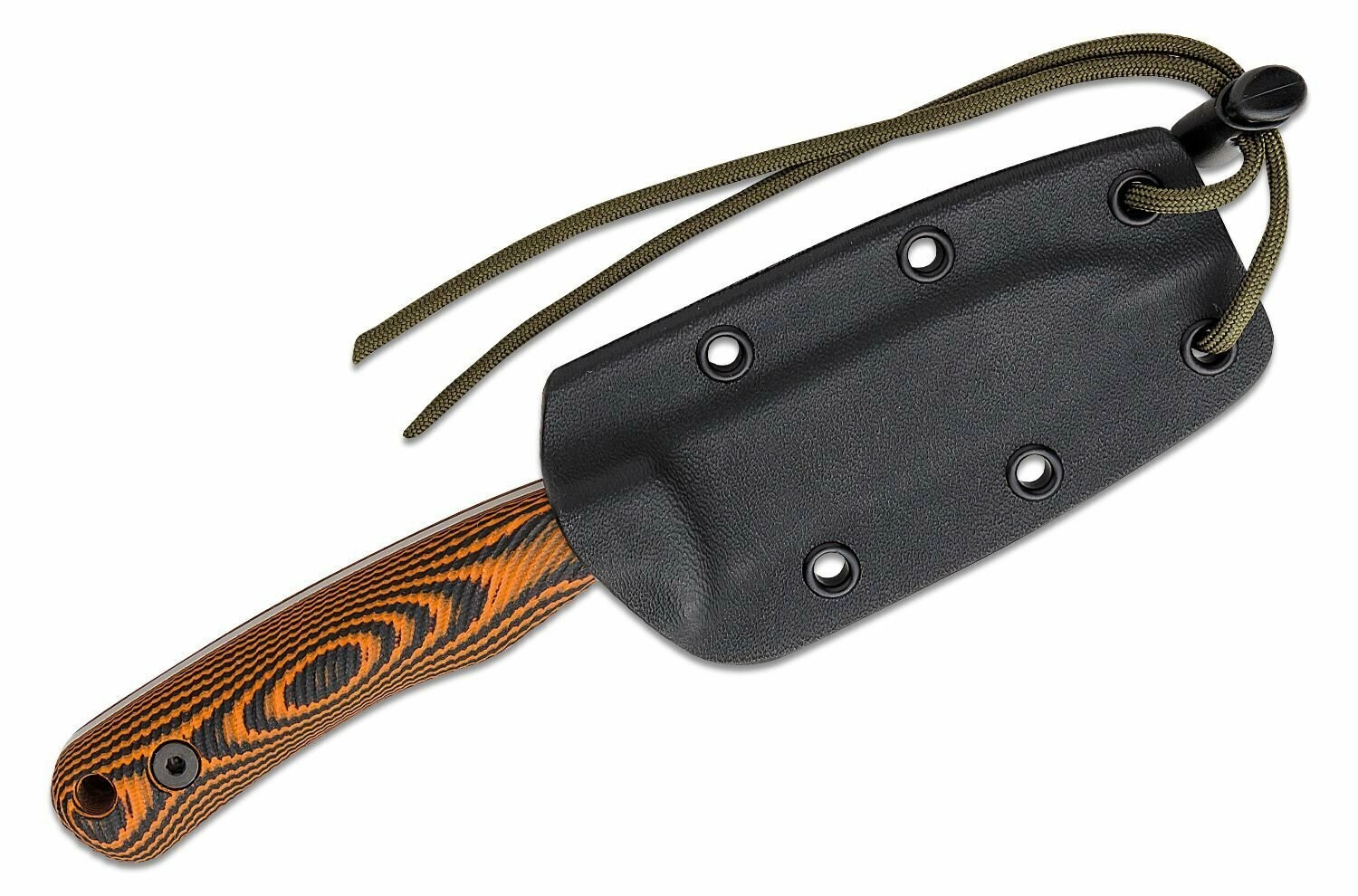 A teljes tang kivitel és a markáns védőív megóvja a kezet a pengére csúszástól. A texturált G10 panelek fekete–narancs kombinációban biztos fogást adnak nedves és hideg környezetben is. A zsinórfuratnak köszönhetően a kés biztosítható vagy könnyebben kihúzható a tokból.