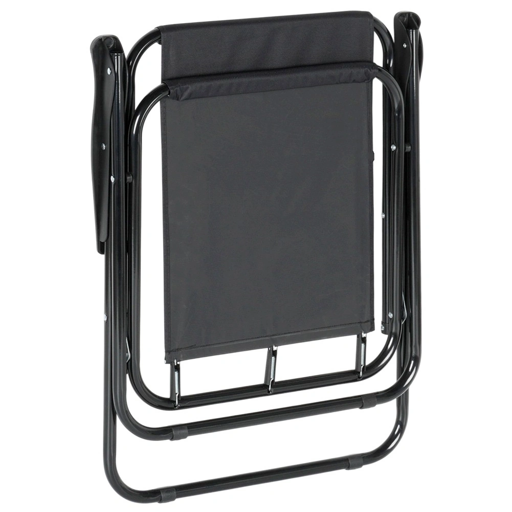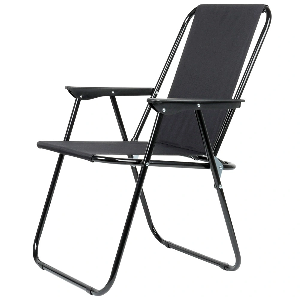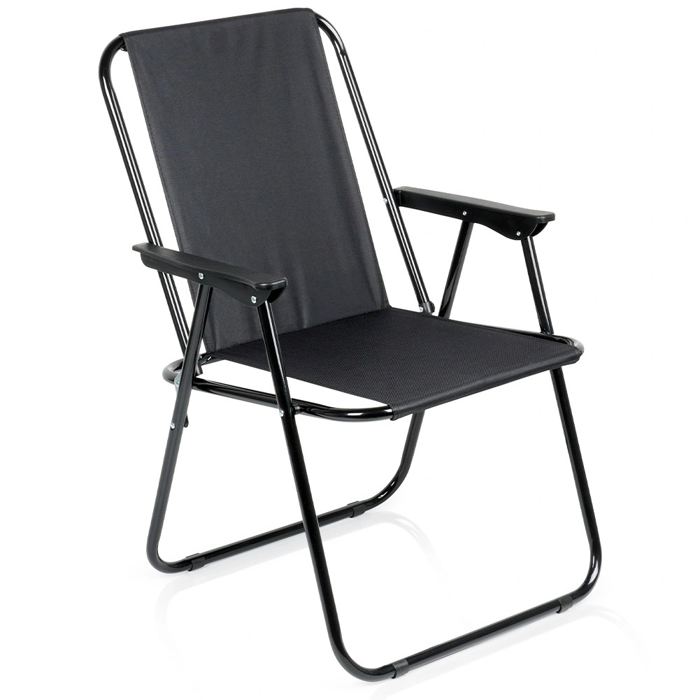 Ez az összecsukható kempingszék megbízható társ minden szabadtéri kalandhoz. A fekete poliészter kárpit és a robusztus fém váz hosszú élettartamot és stabilitást garantál. A karfáknak köszönhetően az ülés hosszabb pihenés során is kényelmes.