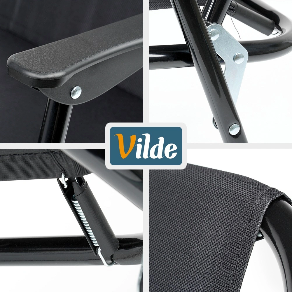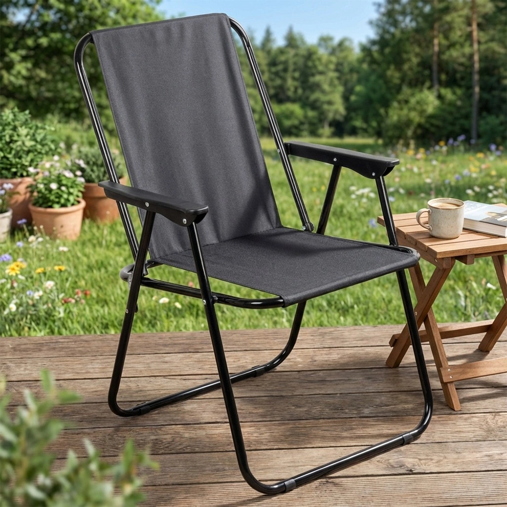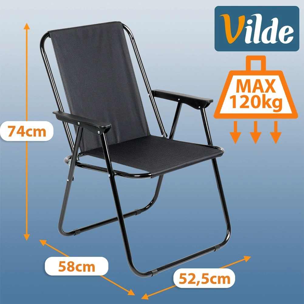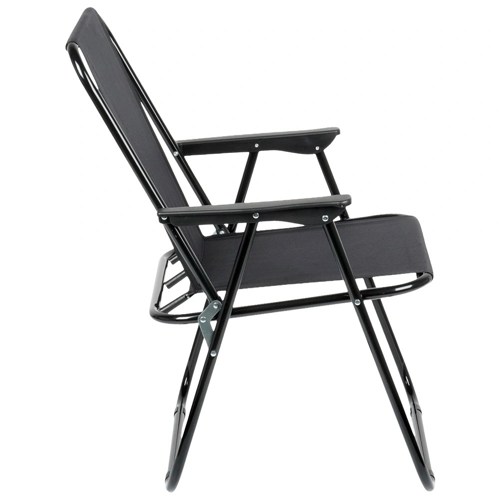 Ez az összecsukható kempingszék megbízható társ minden szabadtéri kalandhoz. A fekete poliészter kárpit és a robusztus fém váz hosszú élettartamot és stabilitást garantál. A karfáknak köszönhetően az ülés hosszabb pihenés során is kényelmes.