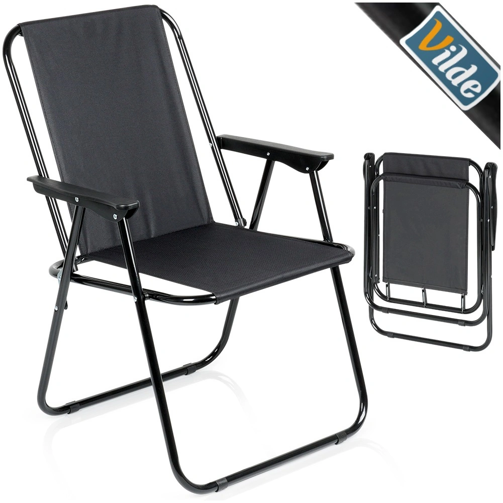 Praktikus, fekete színű összecsukható túraszék, amely könnyű, masszív fémvázzal és kényelmes karfákkal rendelkezik. Összecsukva kompakt méretű, így könnyen szállítható és tárolható. Ideális kempingezéshez, horgászathoz, kertbe, erkélyre és strandra is, legfeljebb 120 kg teherbírással.