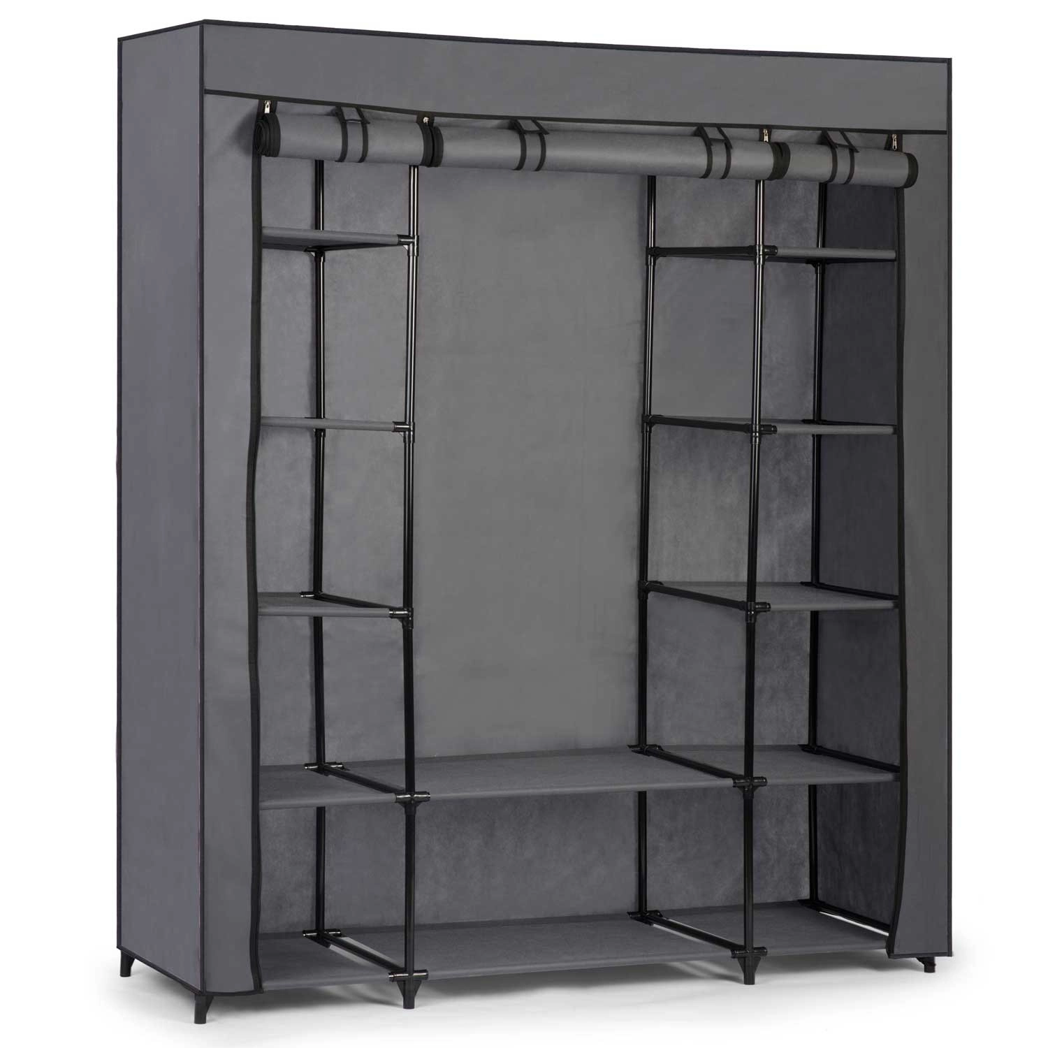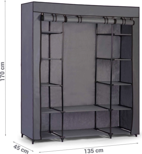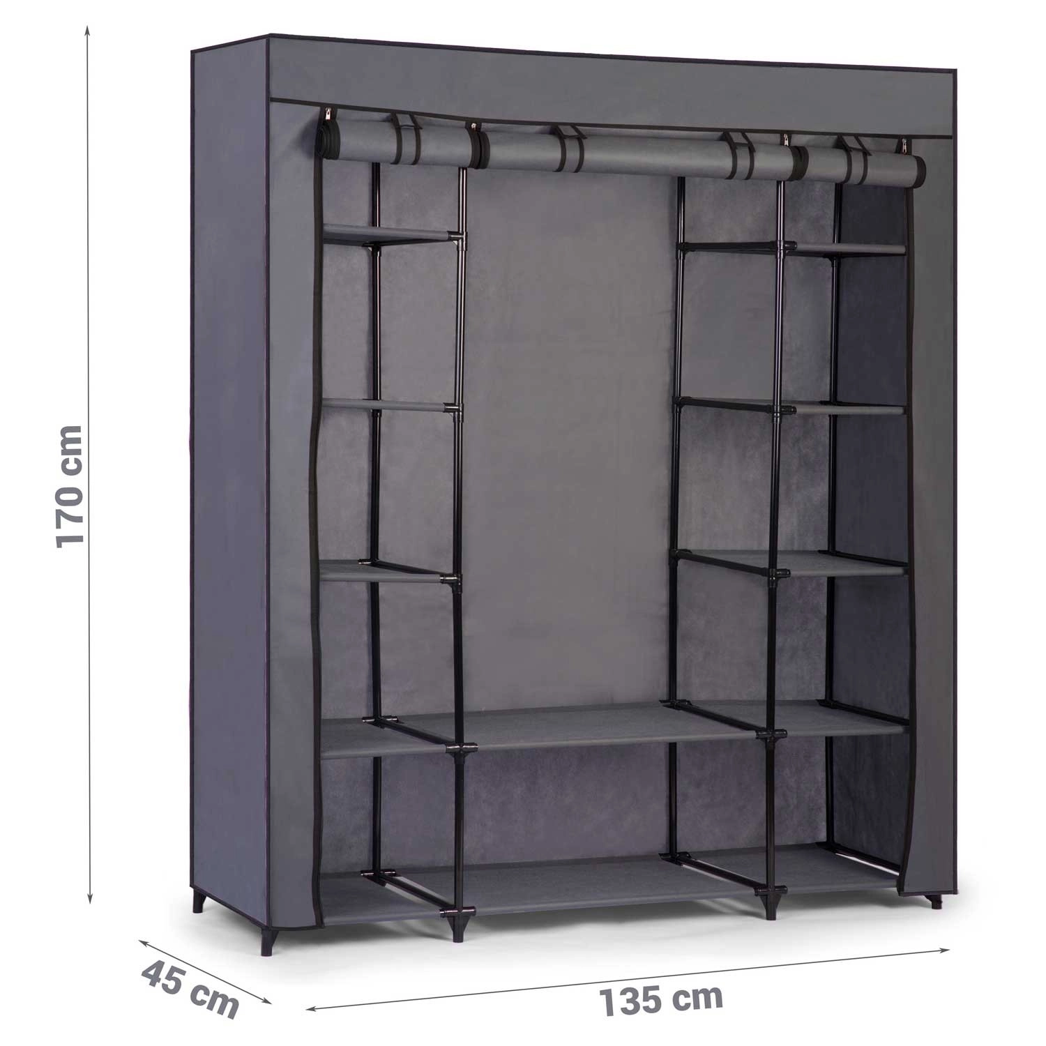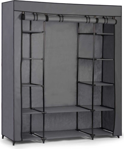Praktikus és tágas Massido textilszekrény grafitszürke színben, 12 masszív polccal, vállfatartó rúddal és acél vázzal a magas stabilitásért. Három különálló rész saját ajtókkal és négy cipzárral a kényelmes hozzáférésért és az áttekinthető tárolásért. Tartós, vízálló anyag és könnyű, intuitív összeszerelés – ideális megoldás hálószobába, gardróbba és előszobába.