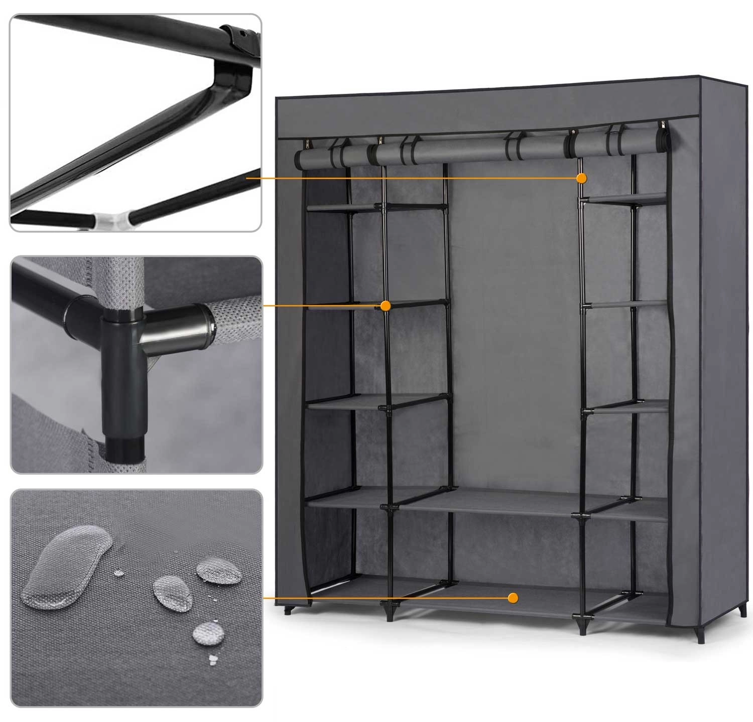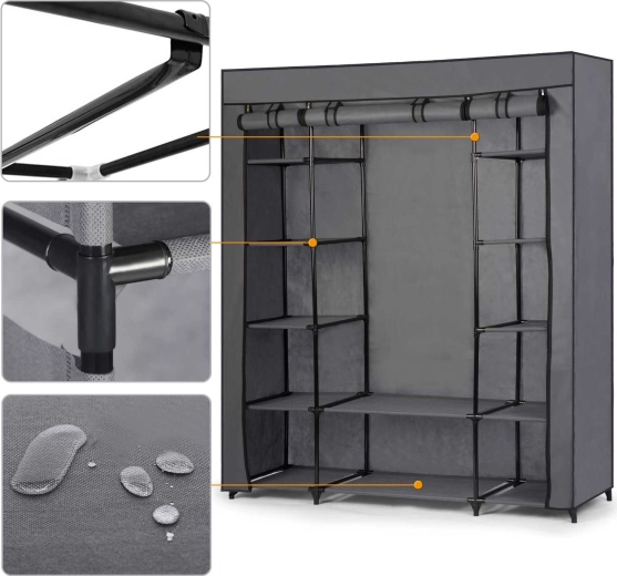 A szekrény 12, nagy teherbírású polcot kínál az összehajtott ruháknak és kiegészítőknek, valamint 1 vállfatartó rudat ingekhez, ruhákhoz vagy dzsekikhez. Az elülső rész négy minőségi cipzárral záródik, így mindig csak azt a részt nyithatja ki, amelyikre szüksége van. Az összeszerelés gyors és intuitív – speciális szerszámok nélkül, néhány perc alatt.