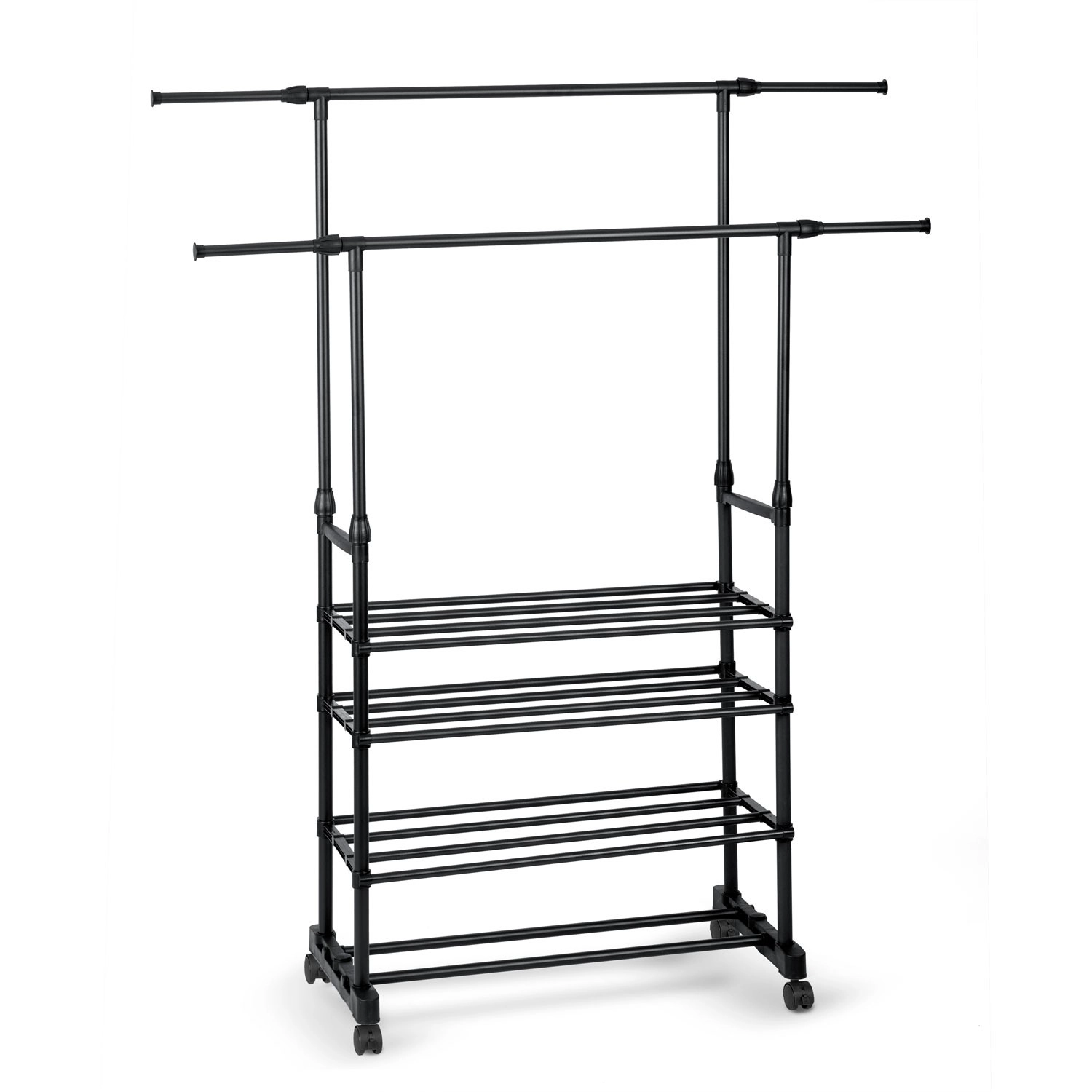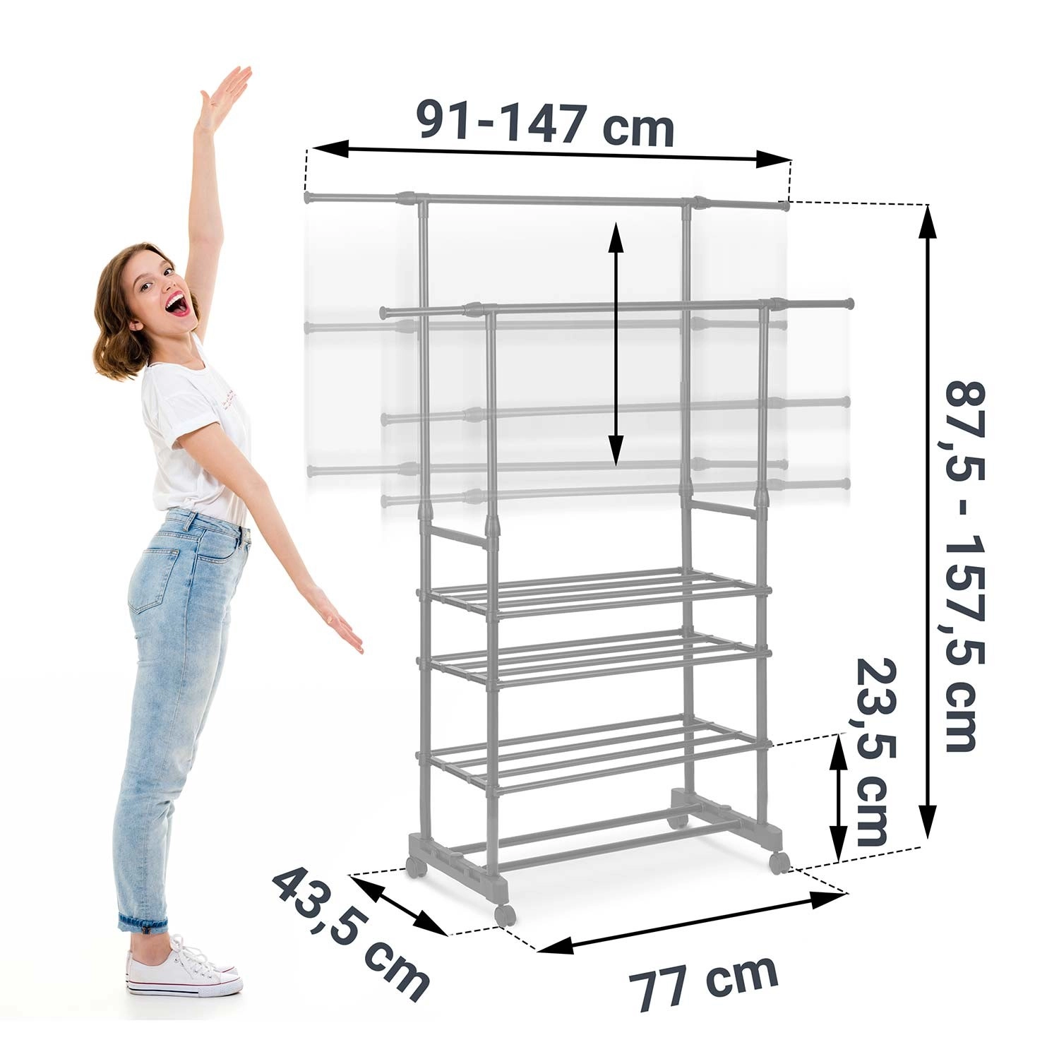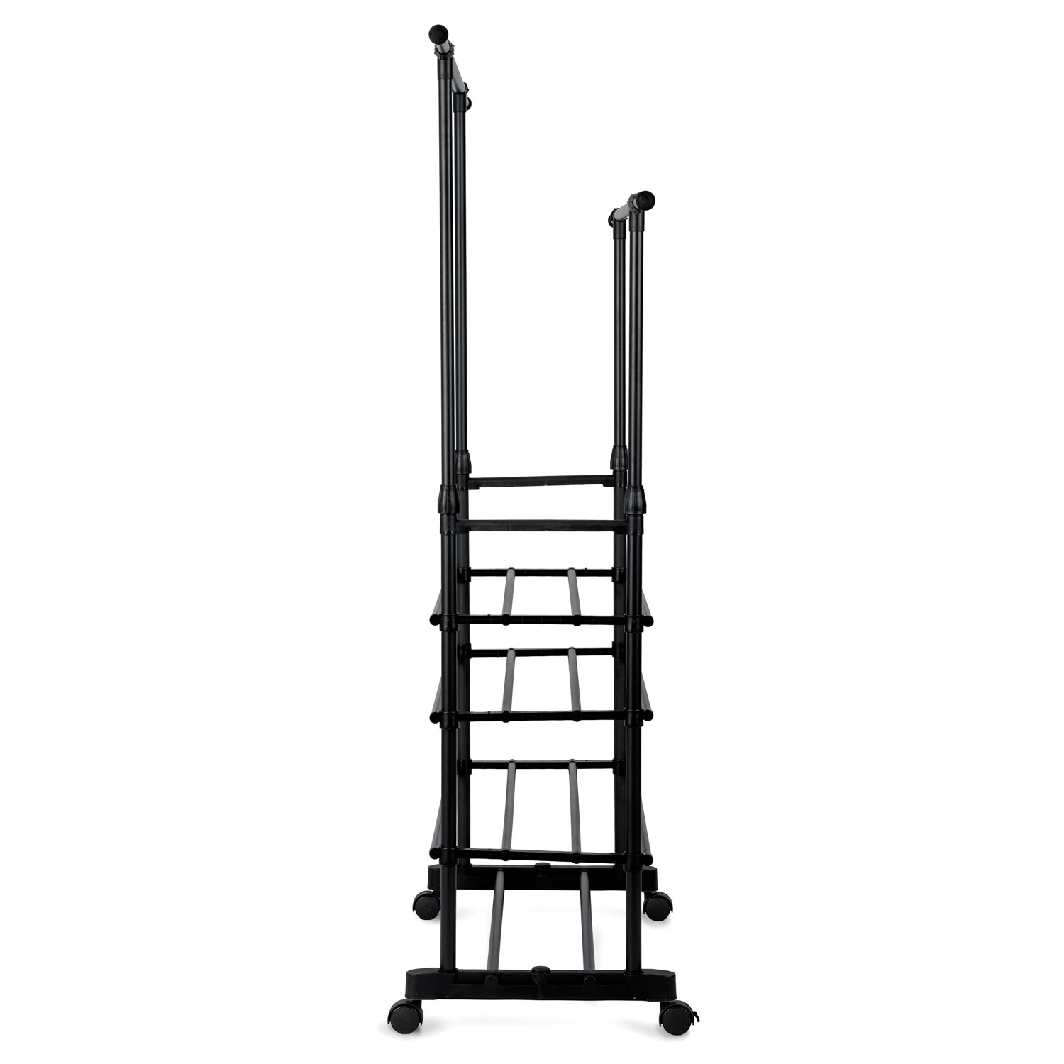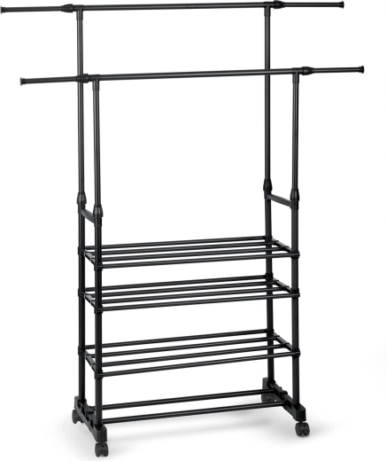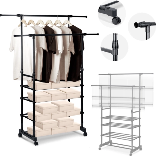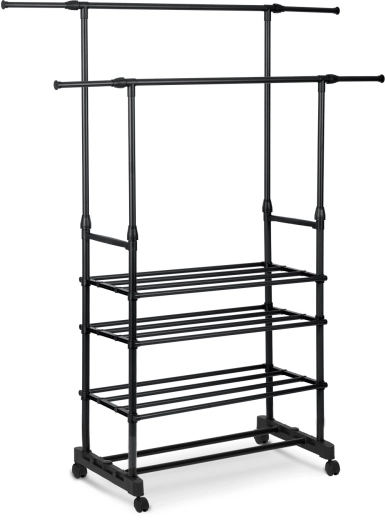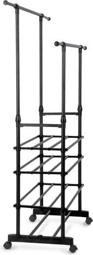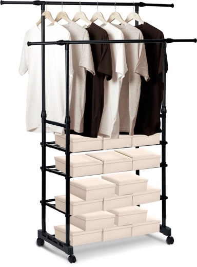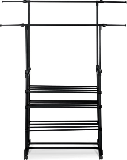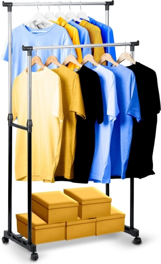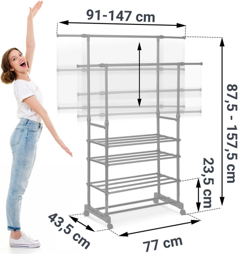 A két felső sín több ruhadarabot befogad, a teleszkópos oszlopoknak köszönhetően pedig könnyedén beállíthatod a magasságot ingekhez és hosszú kabátokhoz.