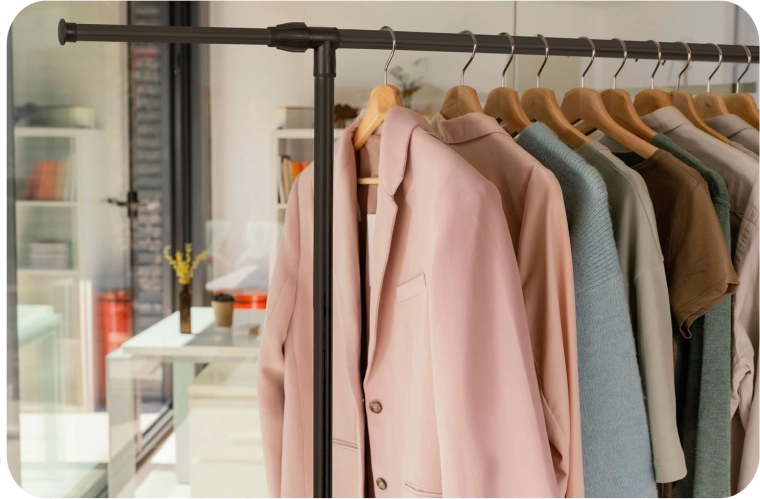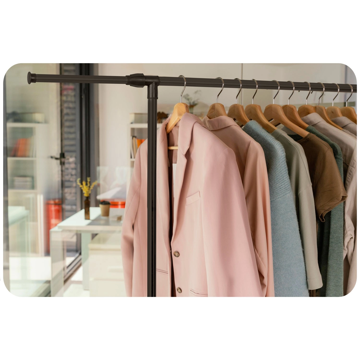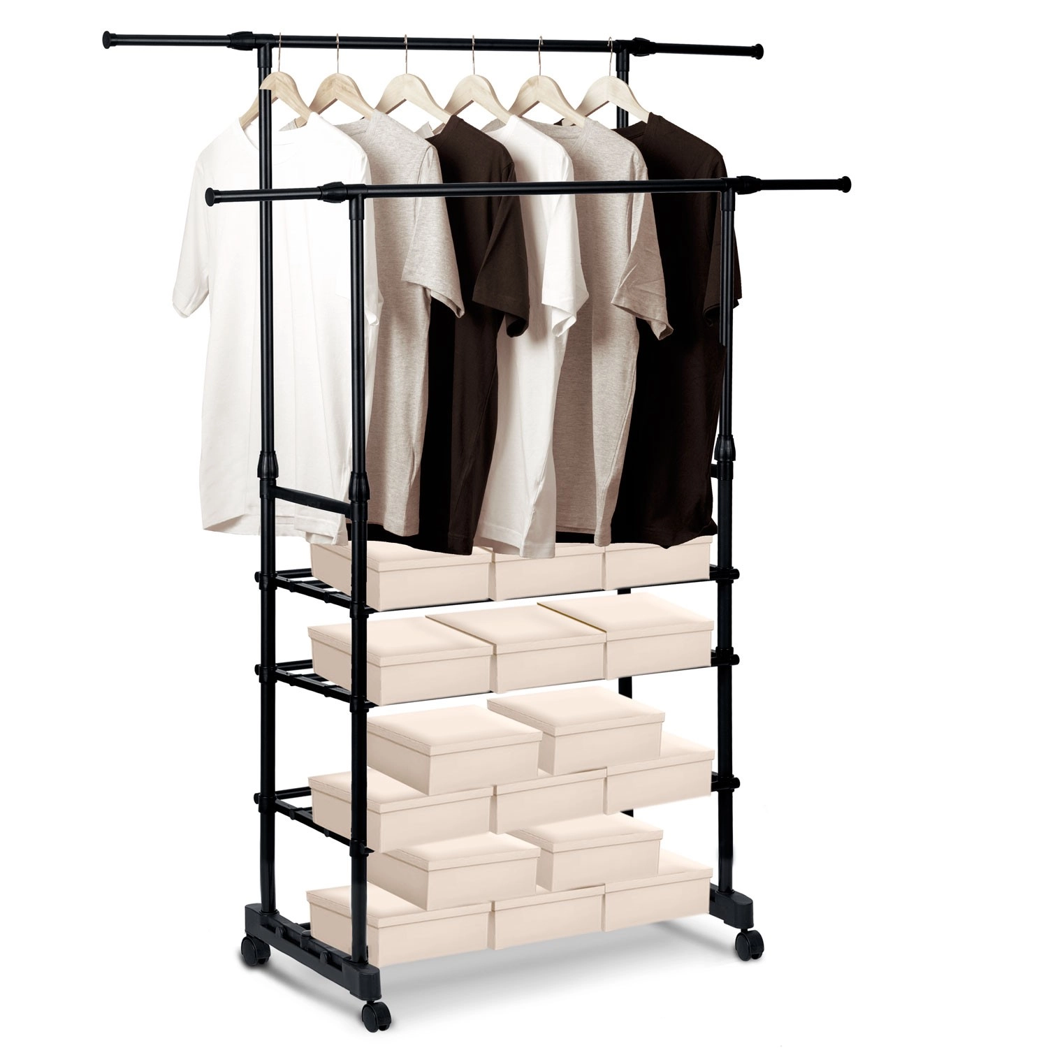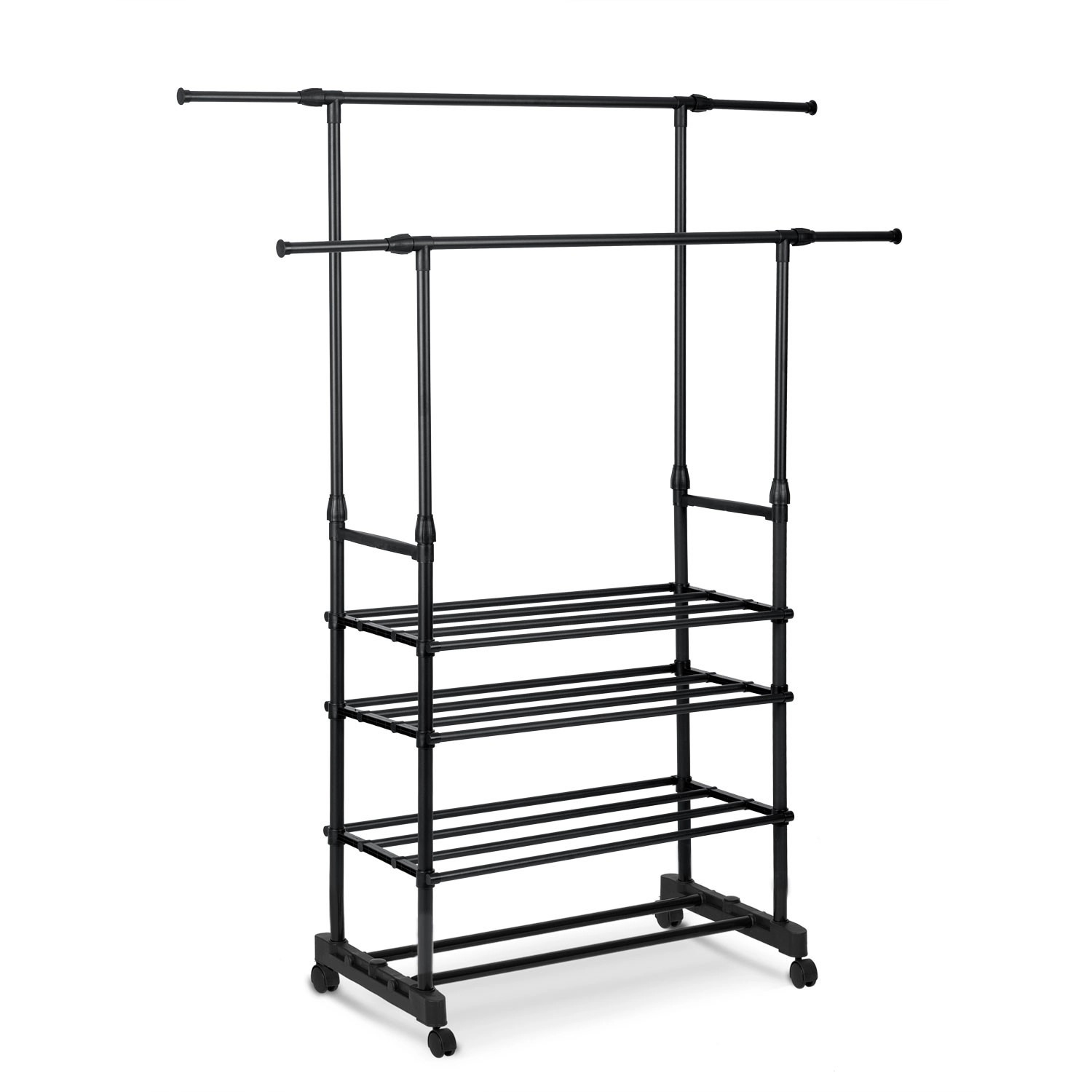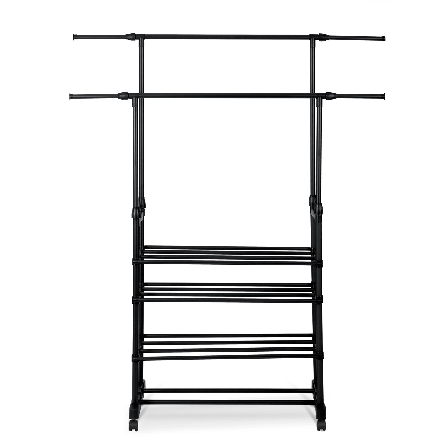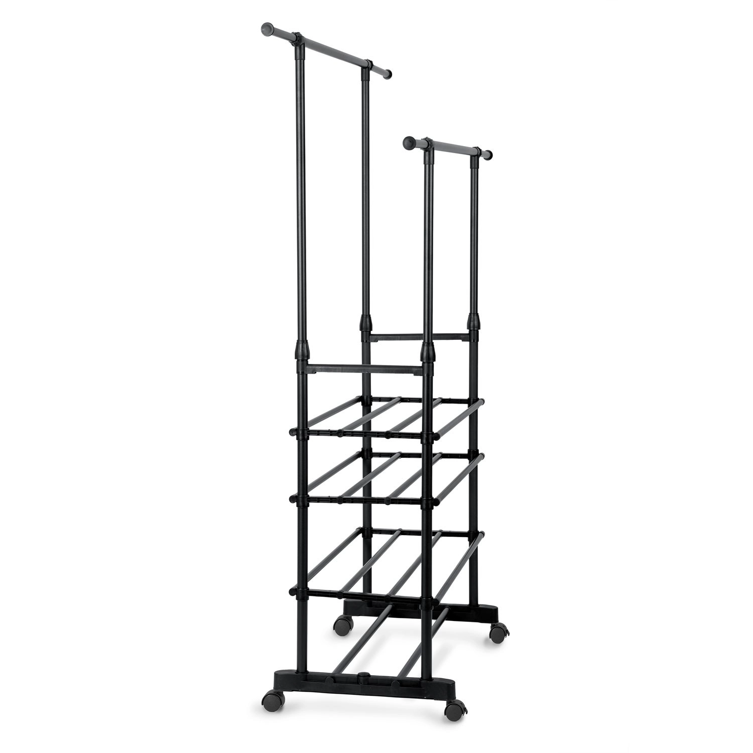 A két felső sín több ruhadarabot befogad, a teleszkópos oszlopoknak köszönhetően pedig könnyedén beállíthatod a magasságot ingekhez és hosszú kabátokhoz.