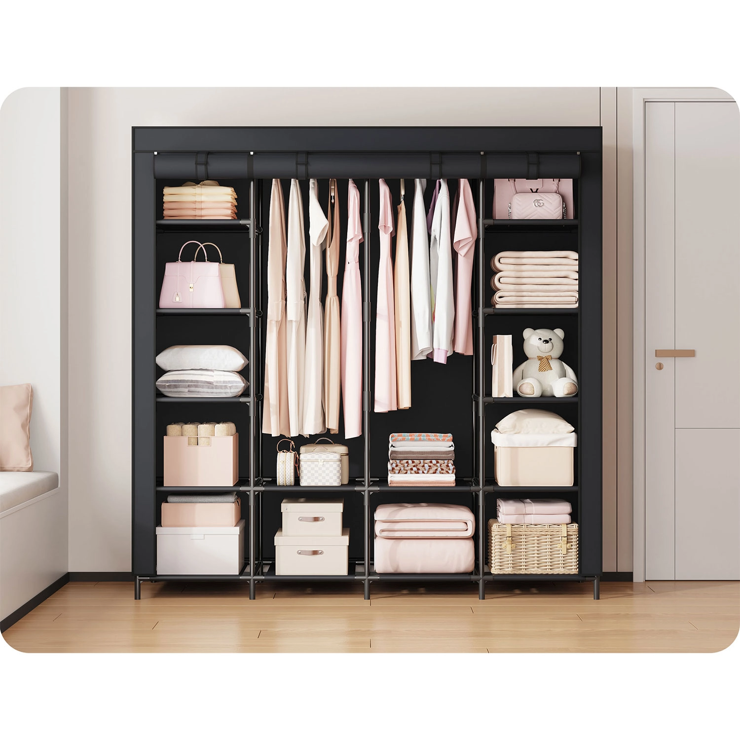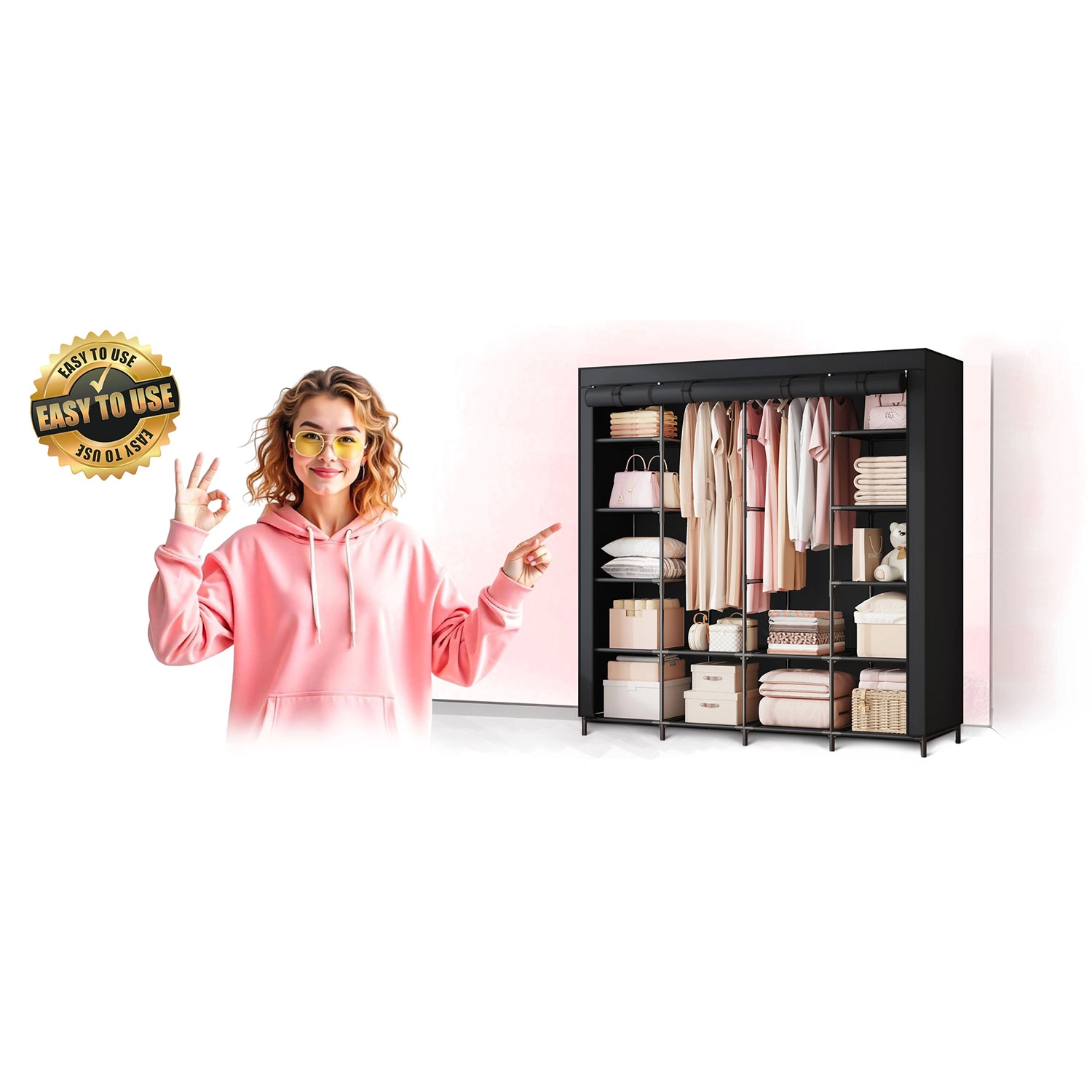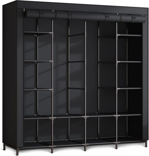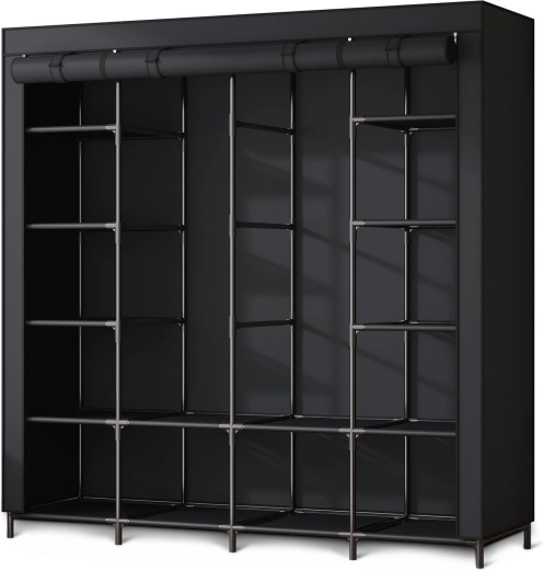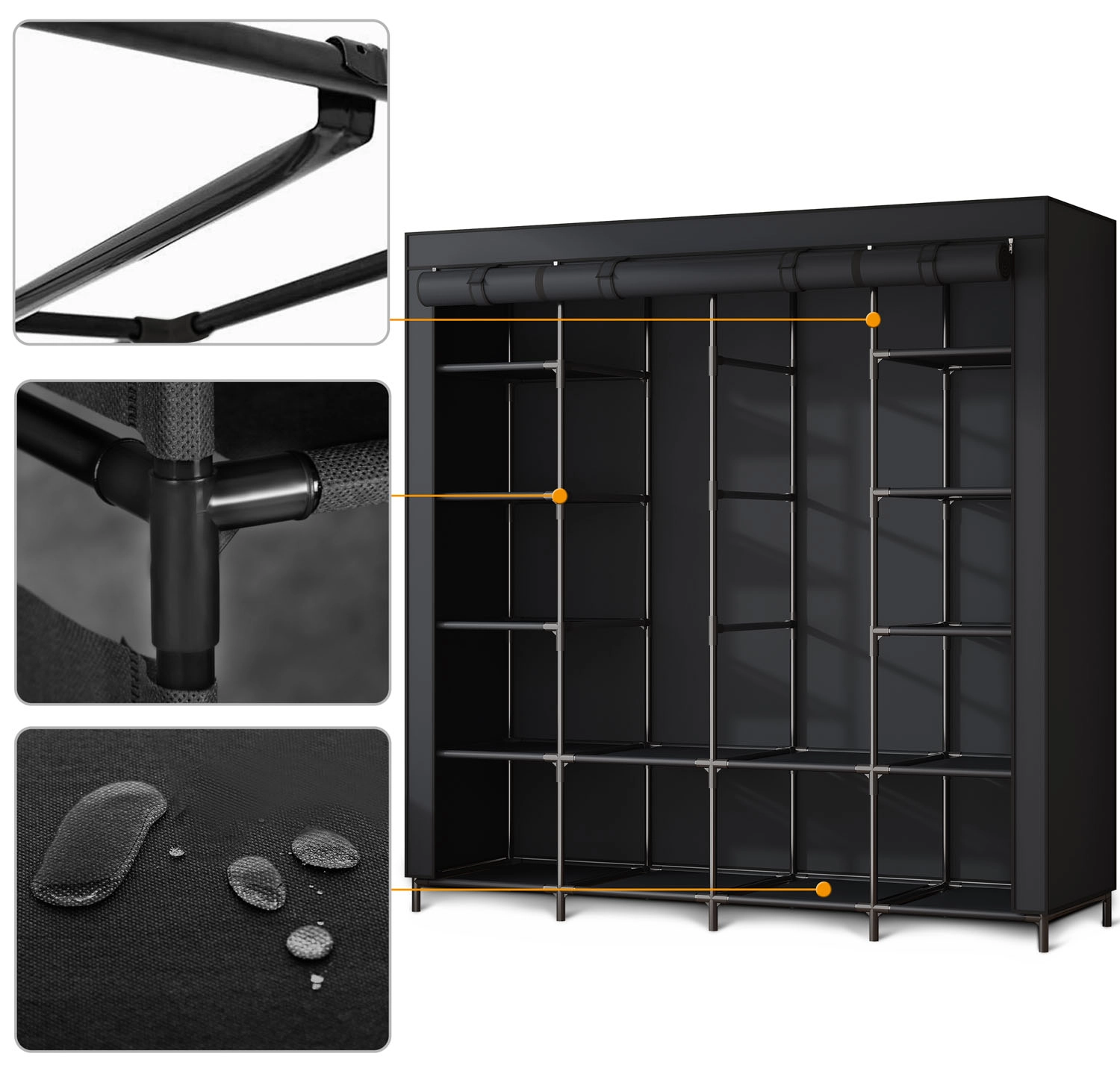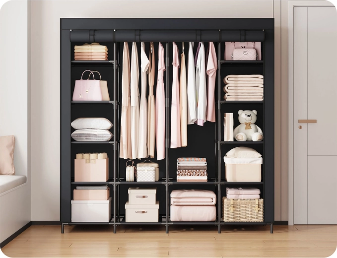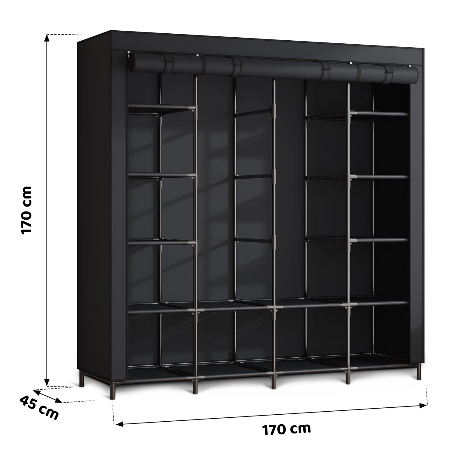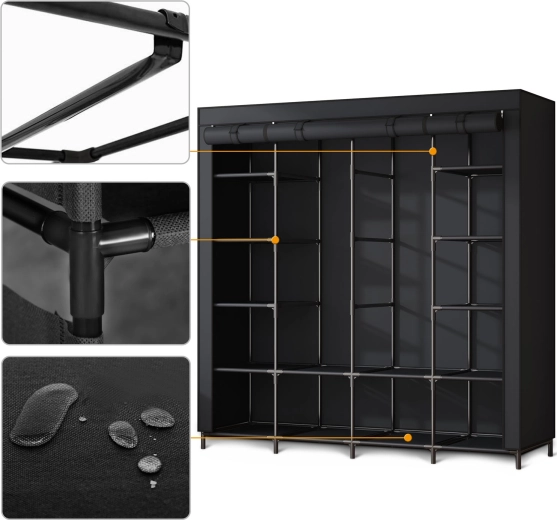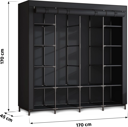 A Massido textil szekrény ideális megoldás hálószobákba, gardróbokba és bérlakásokba. Három külön zónát kínál – egy akasztórudas teret ruhákhoz és ingekhez, valamint oldalsó részeket többpolcos tagolással. A masszív acélváz PP csatlakozókkal biztosítja a stabilitást, míg a vízálló huzat megóvja tárgyait a portól és a nedvességtől.
