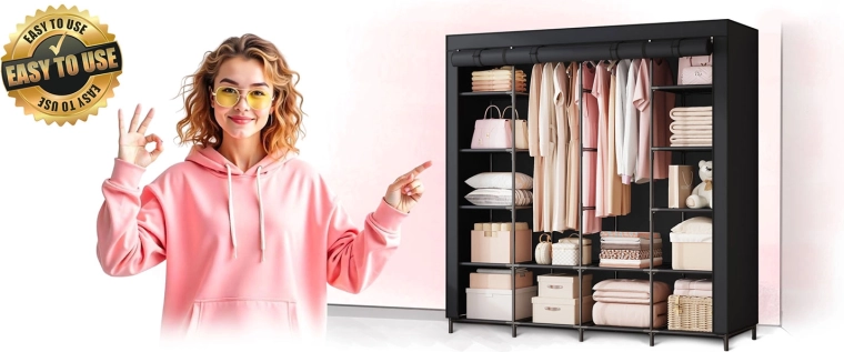 A tagolt polcok elnyelik az összehajtott ruhákat, dobozokat és kiegészítőket, míg az akasztórúd gyűrődésmentesen tartja az ingeket és ruhákat.