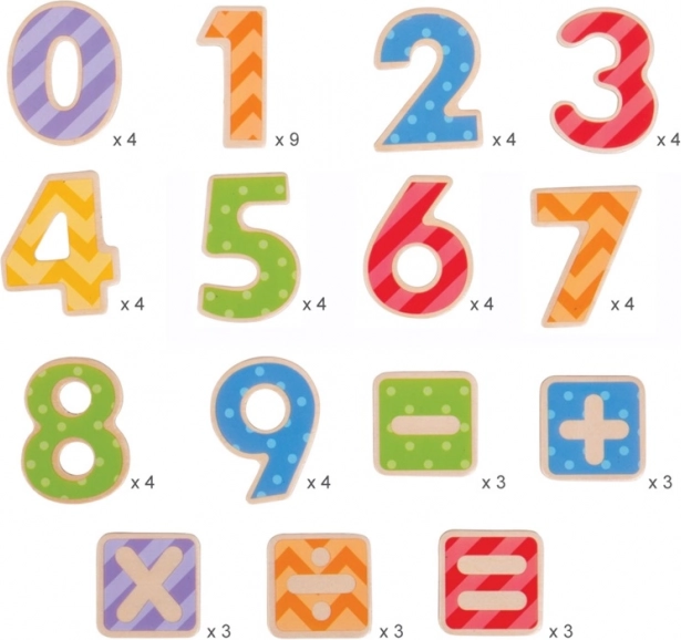 Ebbe a készletbe összesen 56 darab tartozik, amelyek tartalmazzák a 0-tól 9-ig terjedő számokat és különféle matematikai operátoros jeleket. A mágneses számok tökéletes eszközt jelentenek a táblák számára, lehetővé téve a gyerekeknek, hogy könnyen alkossanak példákat és történeteket a számokból. Segítik a kézügyesség és koncentráció fejlesztését és a használatuk biztonságos.
