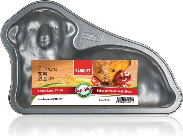 Süssön látványos húsvéti bárányt a CULINARIA formával, 29,3 × 19,2 × 7,6 cm méretben. A 0,5 mm vastag, robusztus szénacél stabilitást és egyenletes átsülést biztosít, míg a PTFE-alapú XYNFLON felület megakadályozza az odatapadást, és lehetővé teszi a gyors kiborítást.