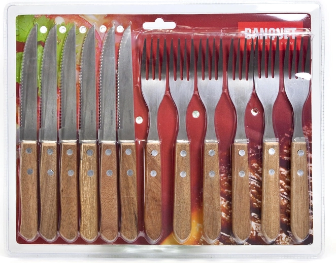 Élvezze a tökéletesen felszeletelt steakeket és más húsos finomságokat a PARTY steak evőeszköz készlettel. A fogazott pengéjű kések könnyedén átvágják a szaftos és omlós húsokat, míg a villák biztos szúrást és kényelmes tálalást nyújtanak. Az elegáns, világos fa nyél természetes megjelenést kölcsönöz az asztalnak, és kényelmes fogást biztosít.