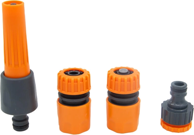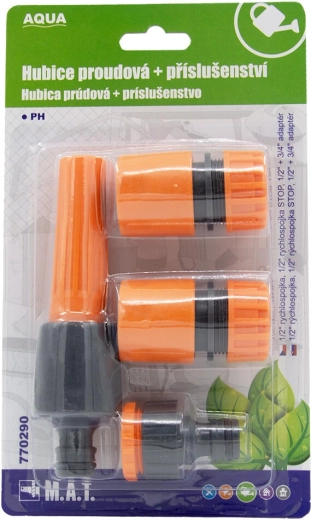 Univerzális kerti öntözőkészlet AQUA sugárpisztollyal és praktikus csatlakozókkal a kényelmes csatlakoztatáshoz és a vízsugár folyamatos beállításához. Tartalmaz 1/2" gyorscsatlakozókat (STOP és átmenő), valamint 1/2" + 3/4" adaptert, amelyek a legtöbb tömlővel és csappal kompatibilisek. Tartós műanyag kivitel, könnyű, egyszerűen használható, ideális a rendszeres kerti karbantartáshoz.