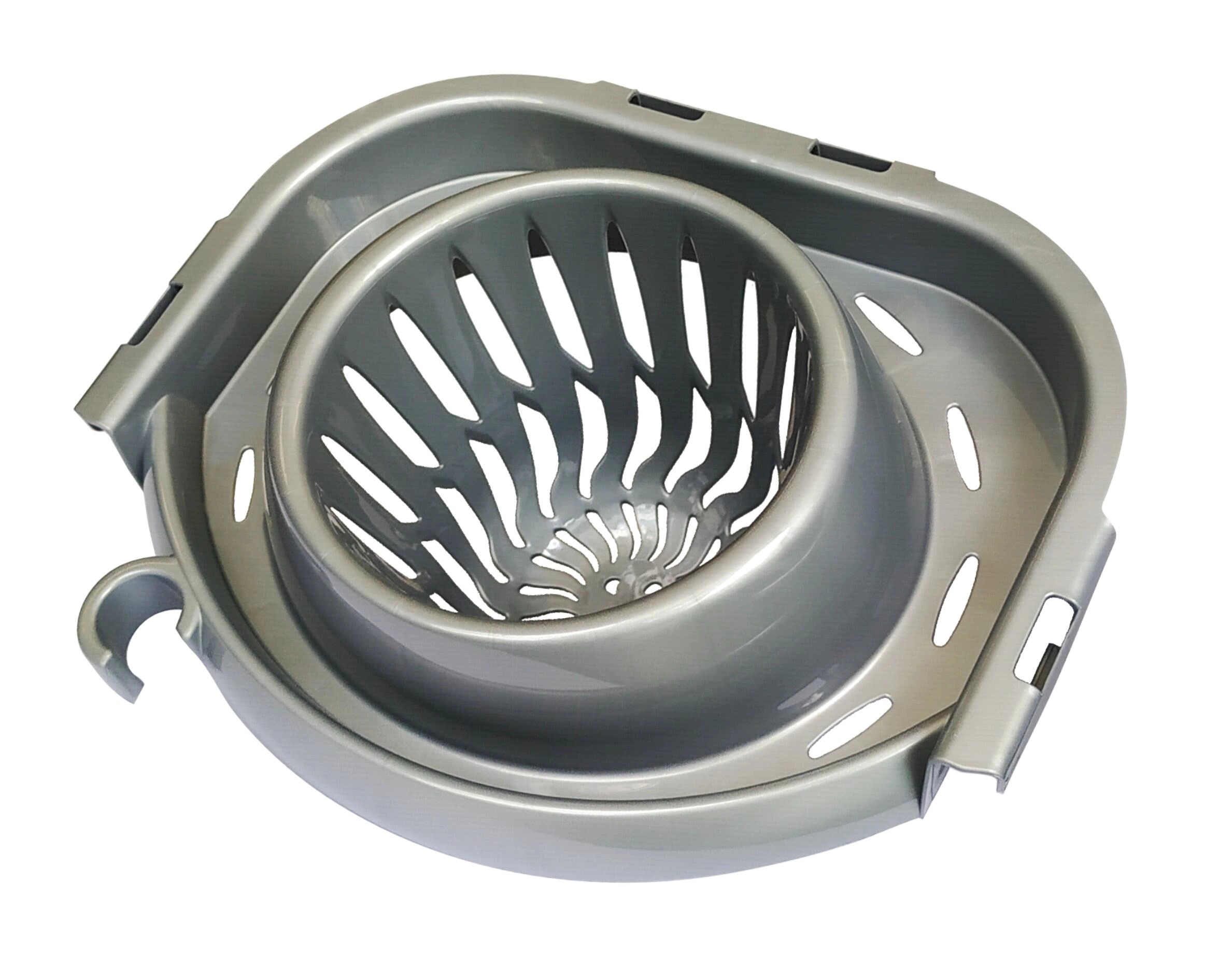 Univerzális ovális vödör csavaróval a felmosás megkönnyítésére anélkül, hogy a kéz érintkezne a szennyezett vízzel. Ergonomikus formájának, stabil aljának és praktikus kiöntőjének köszönhetően a kezelés egyszerű és tiszta. Ezüst kivitele bármely háztartásba vagy irodába illik.