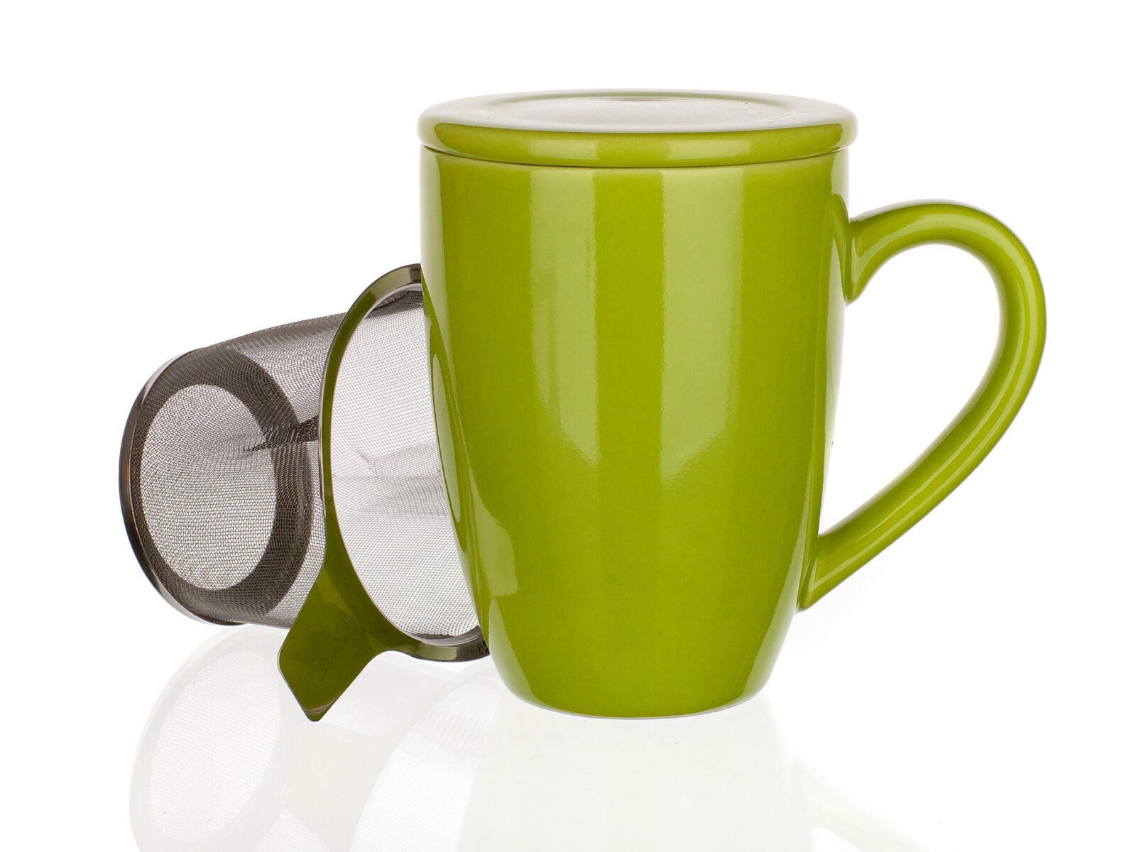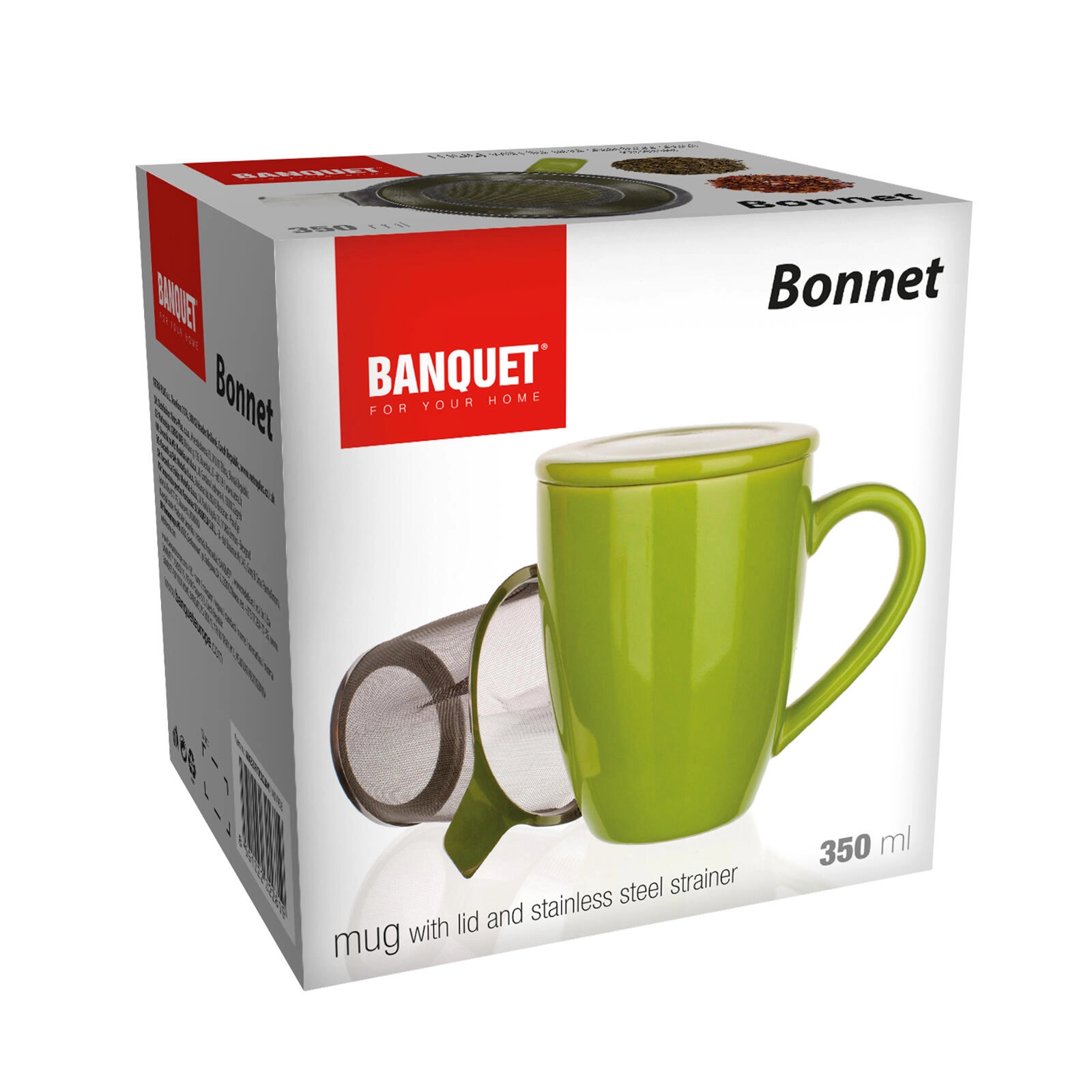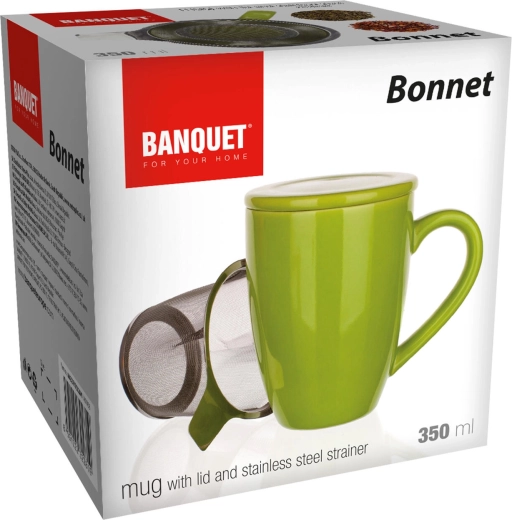 Stílusos zöld BONNET bögre 350 ml űrtartalommal, fedővel és beépített rozsdamentes acél szűrővel – ideális a szálas tea kedvelőinek. Kínál kényelmes áztatást közvetlenül a bögrében, hőmegtartást a fedőnek köszönhetően és könnyű tisztítást – mosogatógépben és mikrohullámú sütőben is használható.