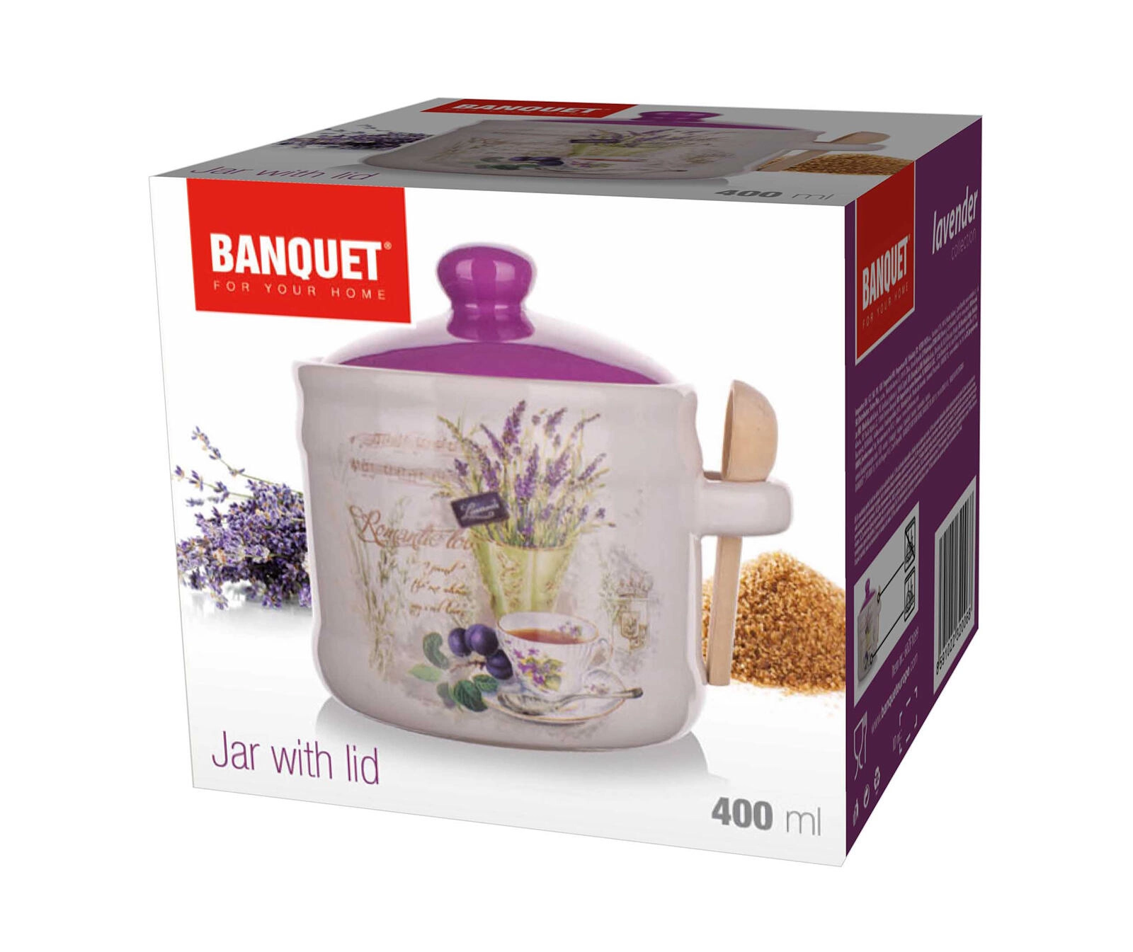 Stílusos, 400 ml-es kerámia élelmiszertároló LAVENDER dizájnnal, ideális cukorhoz, sóhoz vagy fűszernövényekhez. A szorosan záródó fedélnek és a mellékelt fa kanálnak köszönhetően praktikus és esztétikus tárolást kínál. Kerámia kivitel, praktikus fa kanál és finom levendulás dekor teszi teljessé konyhája megjelenését.