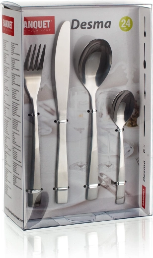 Elegáns, 24 darabos DESMA evőeszközkészlet mindennapi terítéshez és ünnepi alkalmakhoz. A kiváló minőségű rozsdamentes acél magasfényű felületkezeléssel hosszú élettartamot és könnyű tisztítást biztosít. A készlet mindent tartalmaz hat személy számára: kanalak, villák, kések és teáskanalak átgondolt anyagvastagsággal a kényelmes használathoz.
