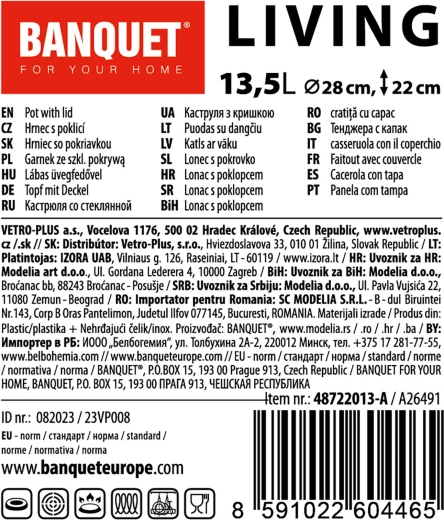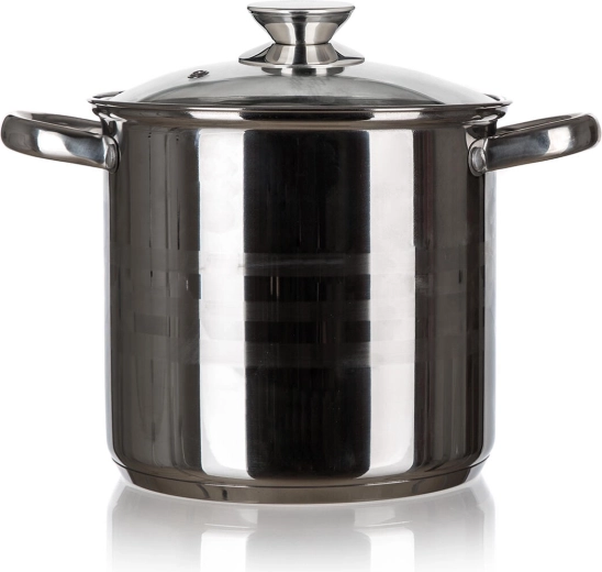 Tágas LIVING rozsdamentes acél fazék 13,5 l űrtartalommal és üvegfedővel, ideális levesekhez, alaplevekhez és nagyobb adagokhoz. Kínálja a 28 cm átmérőt, a minőségi 201-es rozsdamentes acélt, a rozsdamentes gombbal ellátott üvegfedőt, valamint a kompatibilitást minden főzőfelülettel, beleértve az indukciót.