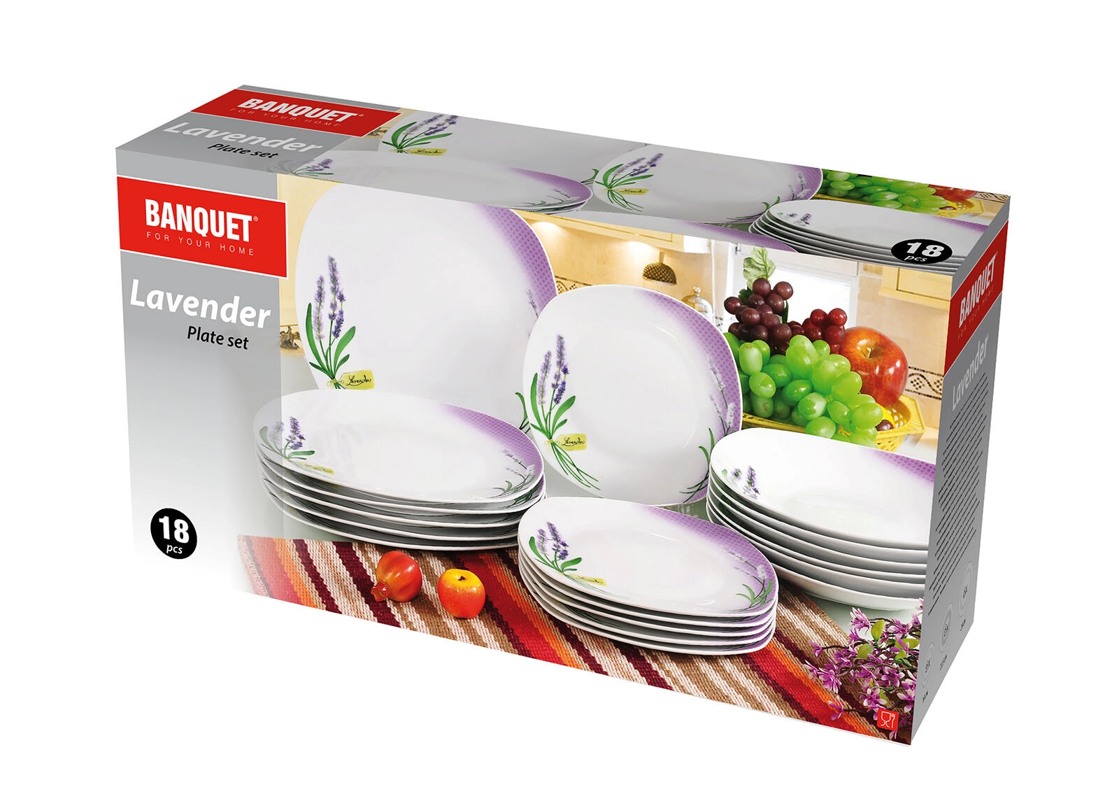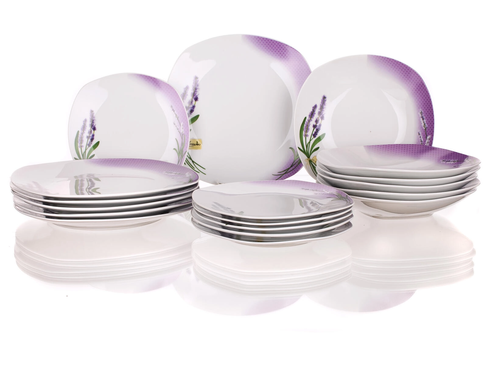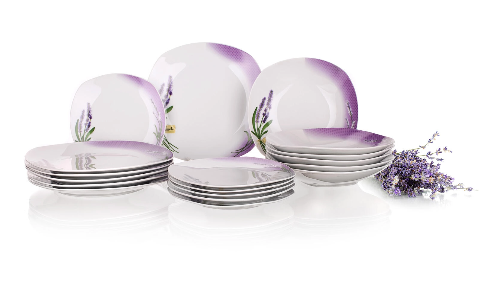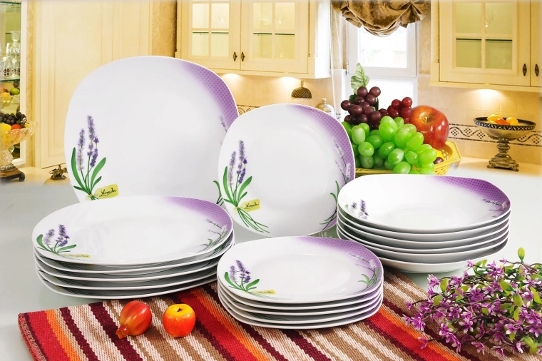 A 18 darab mély-, lapos- és desszerttányért tartalmaz – mind egyetlen, egységes Lavender Square dizájnban a tökéletes, mindennapi terítékhez.