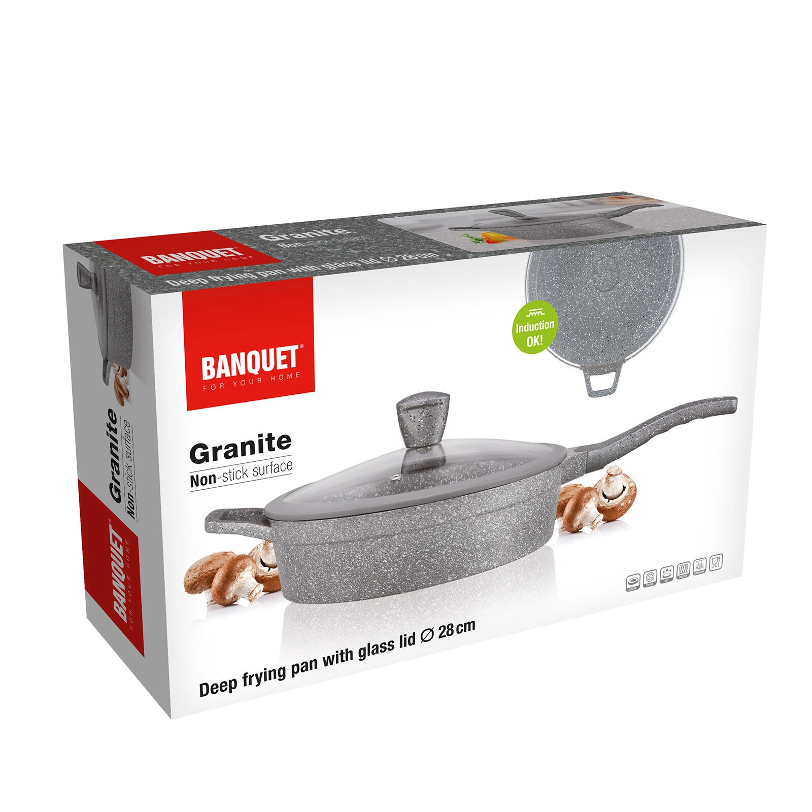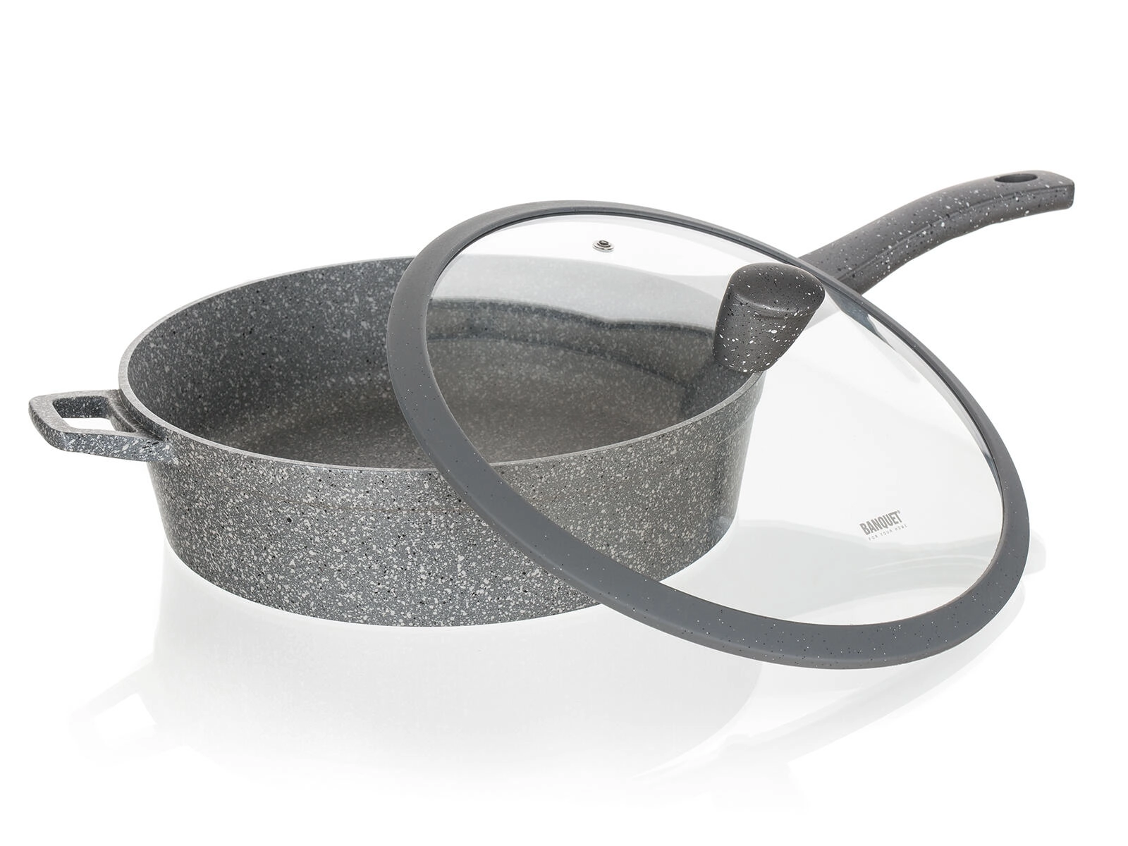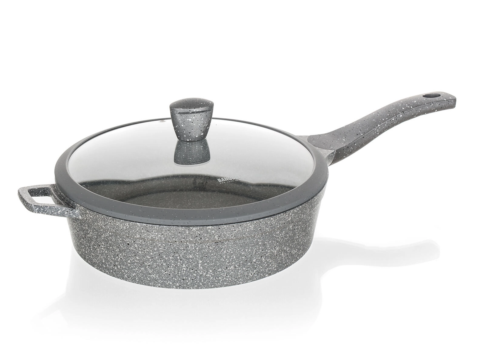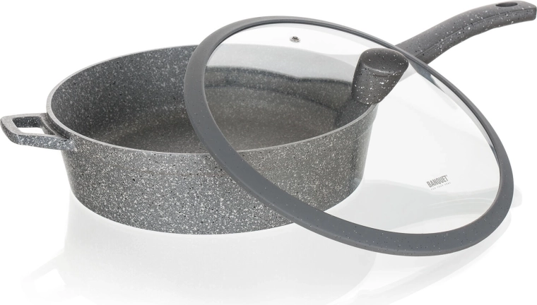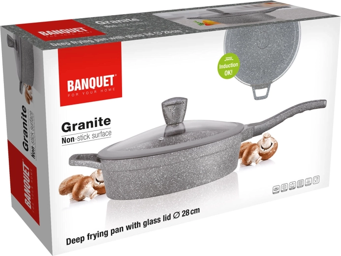Ez a szürke, gránit hatású mély serpenyő ideális pirításhoz, sütéshez és pároláshoz. A tapadásmentes felület minimálisra csökkenti az olajszükségletet, megakadályozza az odaégést és megkönnyíti a tisztítást. Az üvegfedő szilikonbevonatú gombbal biztonságos kezelést tesz lehetővé, és bent tartja a hőt és a nedvességet.