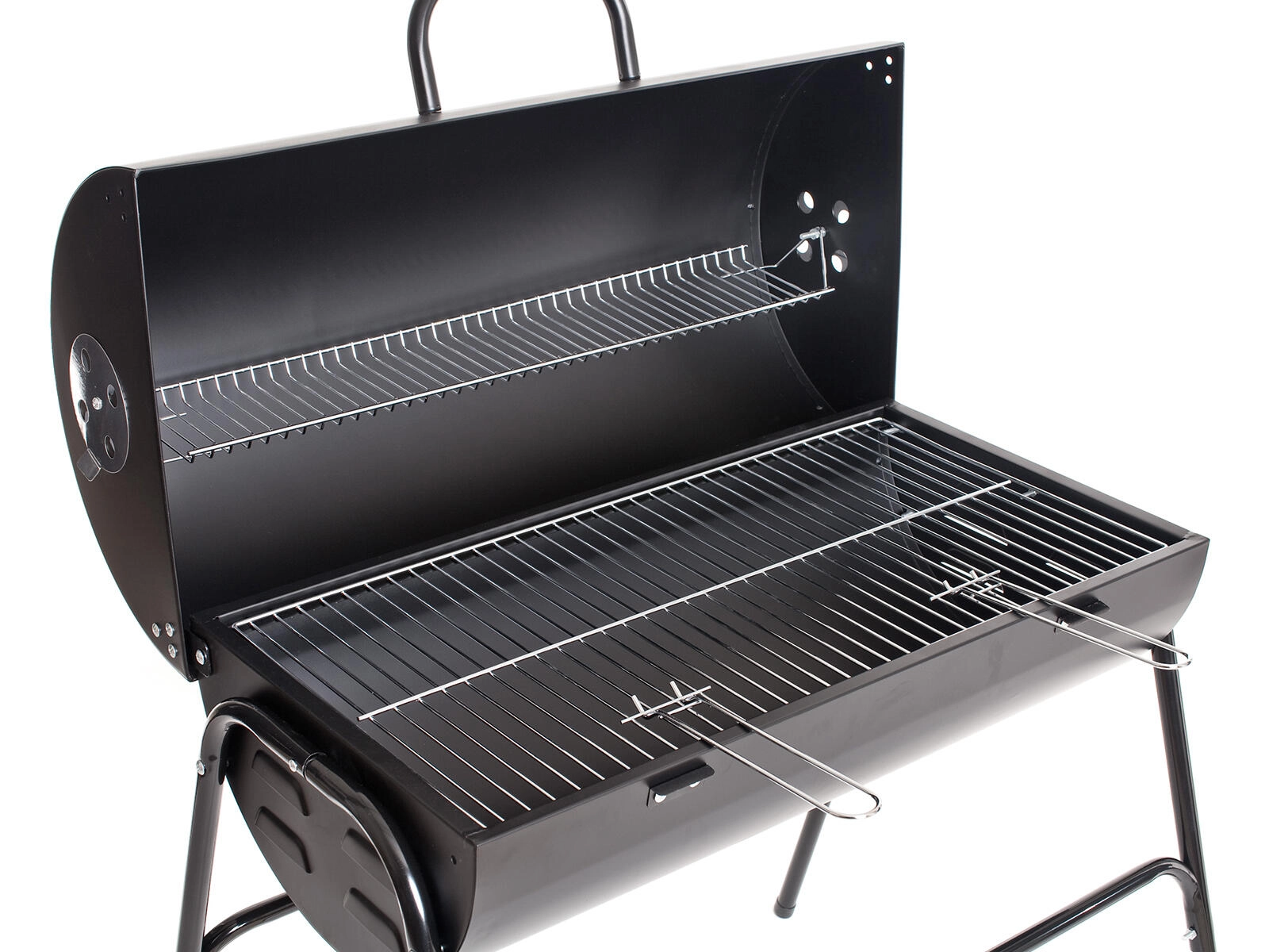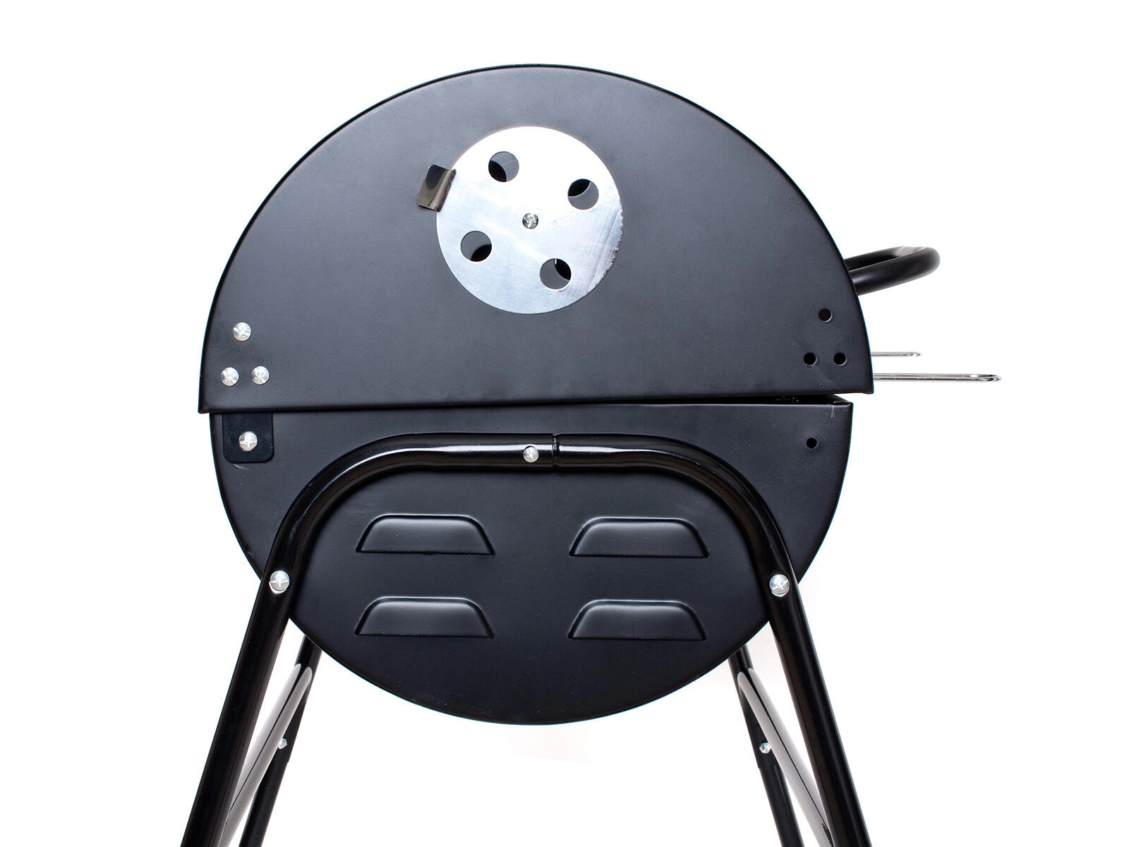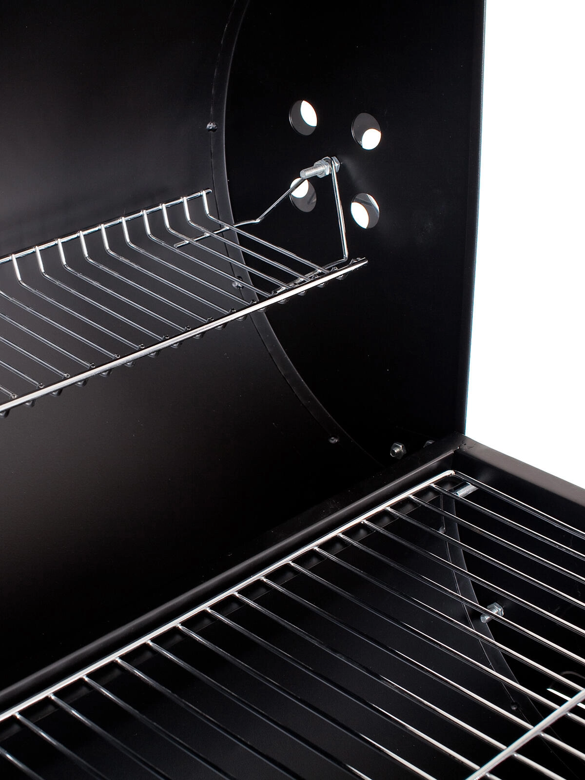 A masszív Rancher faszenes kerti grill ideális szabadtéri főzéshez a kertben, nyaralóban vagy kempingezéskor. Tágas sütőfelületet kínál két rácscsal – egy fő és egy felső melegen tartó rács – krómozott acélból az egyenletes átsülésért és hőmegtartásért. Egyszerű, mégis erős felépítésének köszönhetően a grill stabil, könnyen kezelhető, és a pontos levegőszabályozást oldalsó szellőzők segítik. A fedélbe épített hőmérő támogatja a megfelelő hőmérséklet felügyeletét grillezéshez és enyhe füstöléshez.
