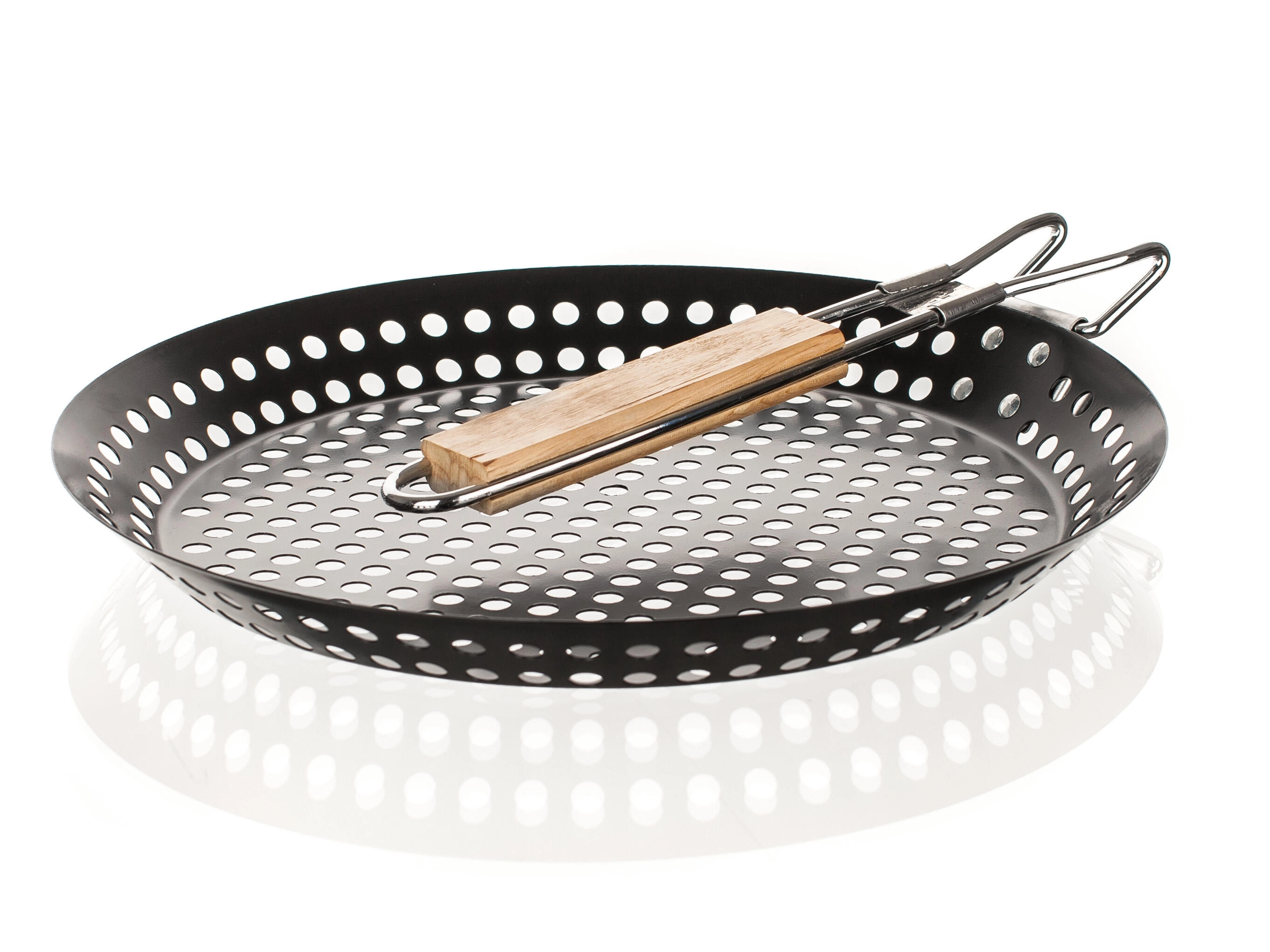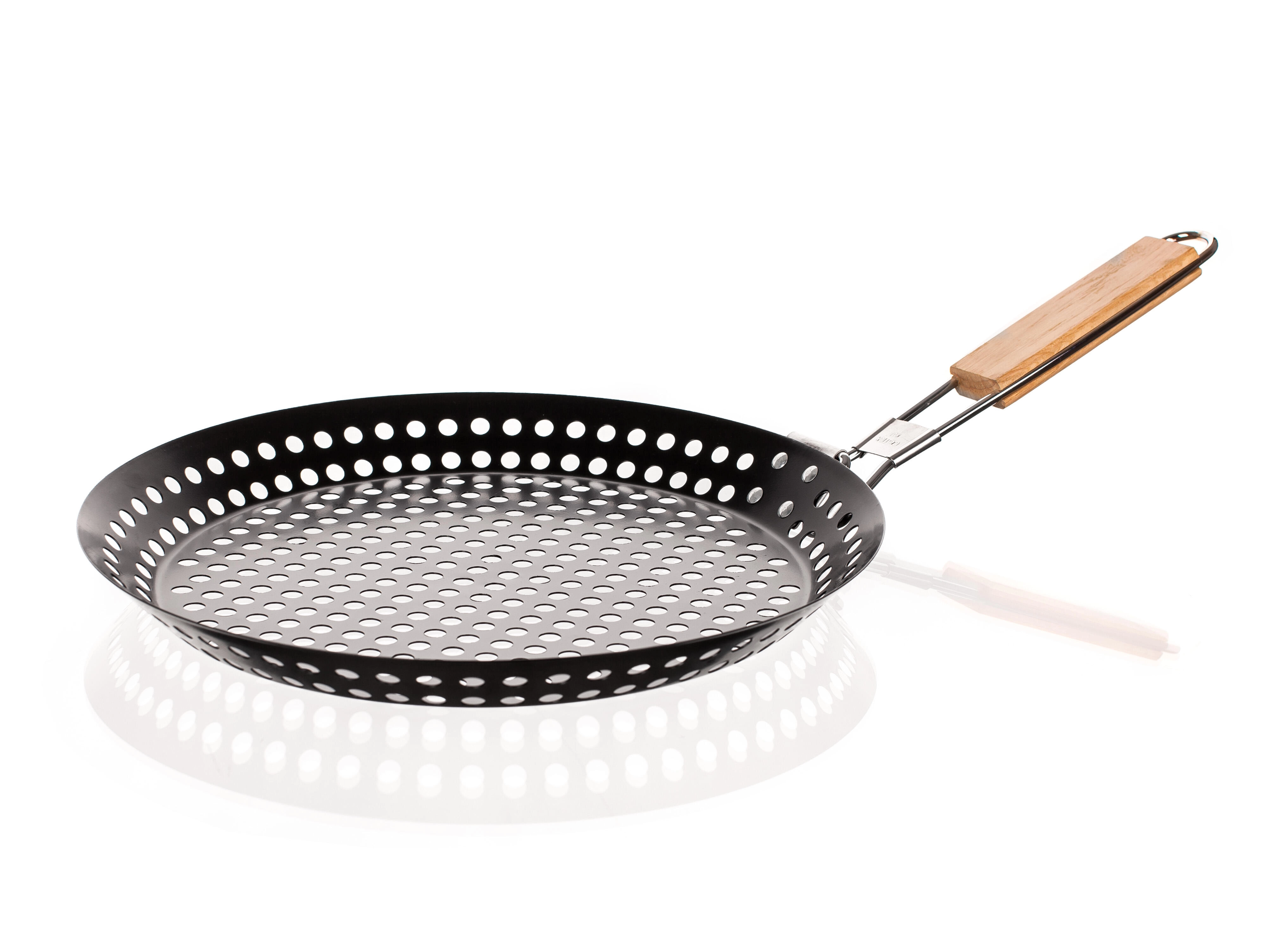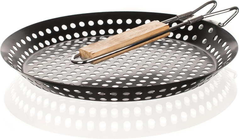 A lehajtható fa nyélnek és a fém keretnek köszönhetően a serpenyő jól tárolható, és forró grill felett is biztonságosan kezelhető. Kiváló választás kisebb vagy törékenyebb alapanyagokhoz, amelyek egyébként átesnének a rácson.