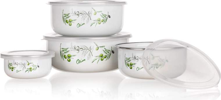 Praktikus, négy darabos zománcozott tálkakészlet műanyag fedőkkel és OLIVES dekorral élelmiszerek tárolásához. A tálkák könnyűek, strapabírók, és a fedőknek köszönhetően a tartalom sokáig friss marad. A rakásolható kialakítás helyet takarít meg, a különböző űrtartalmak pedig lefedik a mindennapi konyhai igényeket.