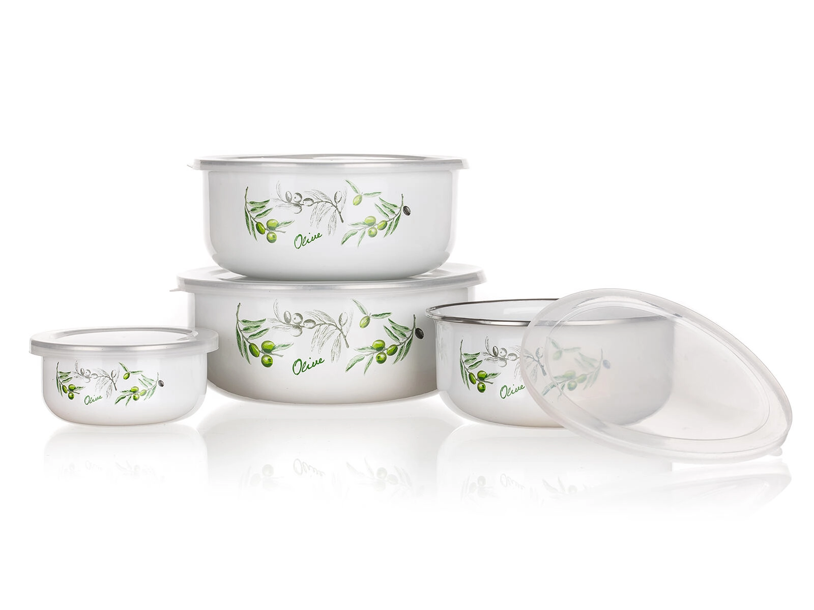 Az OLIVES tálkakészlet a klasszikus zománcot praktikus, átlátszó fedőkkel ötvözi. A négy méret 0,2-től 1,3 literig lefedi az uzsonnákat, köreteket és az ételmaradékokat is. Az elegáns, olívadísszel ellátott fehér felület bármely konyhába illik, és a tálkák csinos tálalóedényként is megállják a helyüket.