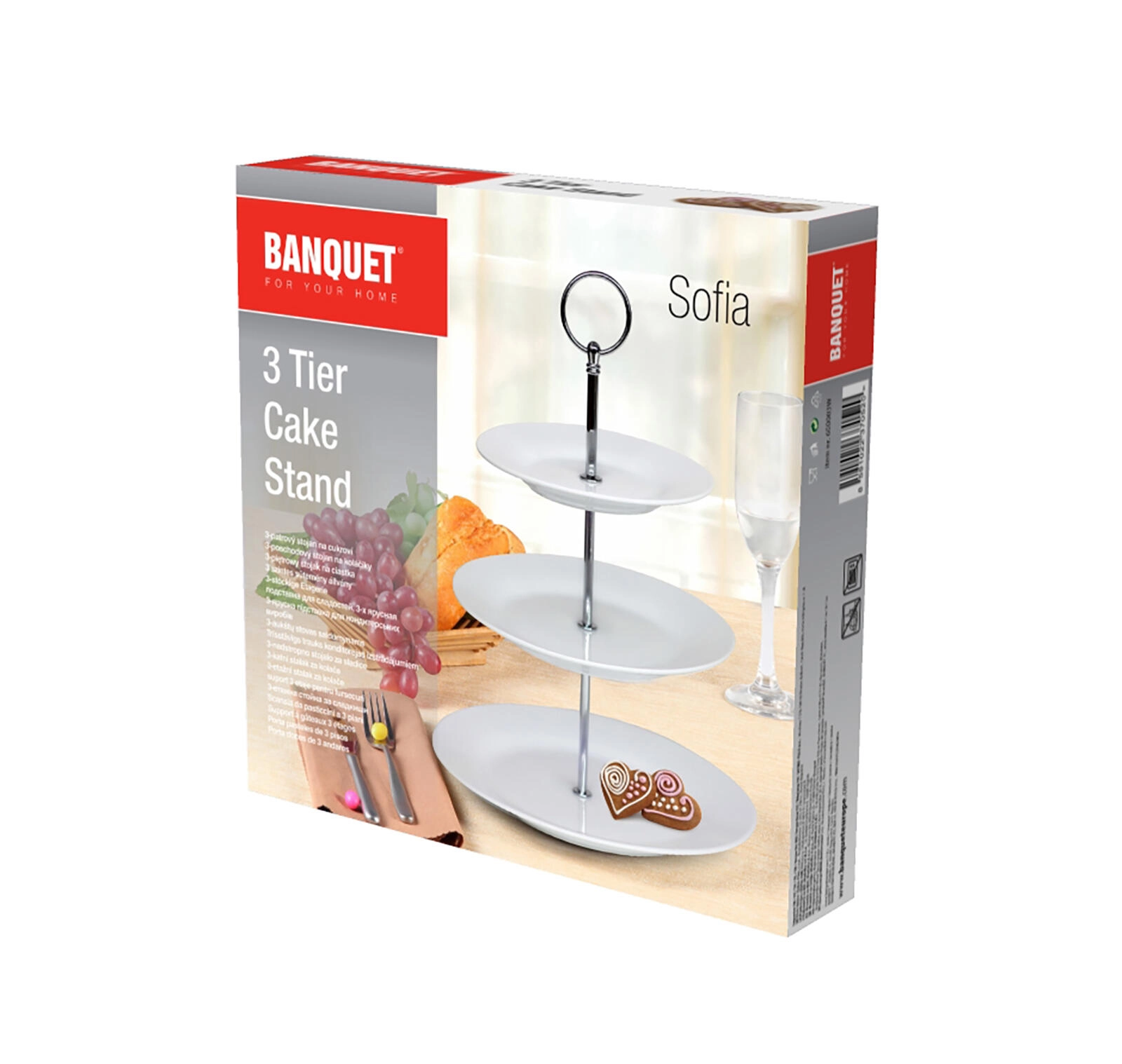 Elegáns, háromszintes Sofia kínálótál minőségi fehér porcelánból, ideális sütemények, mini tortácskák és gyümölcsök tálalásához. A három, különböző átmérőjű kerek tányérnak köszönhetően bőséges helyet, stabil szerkezetet és stílusos megjelenést kínál minden ünnepi asztalhoz vagy otthoni vendéglátáshoz.
